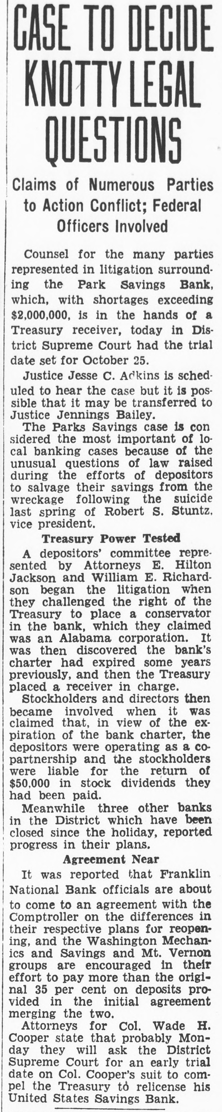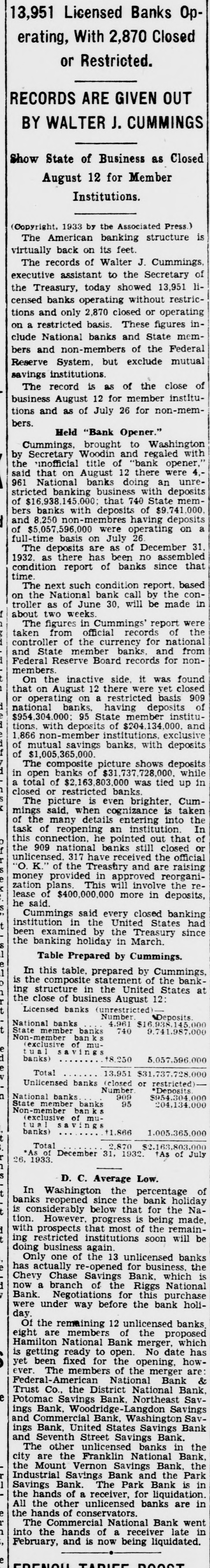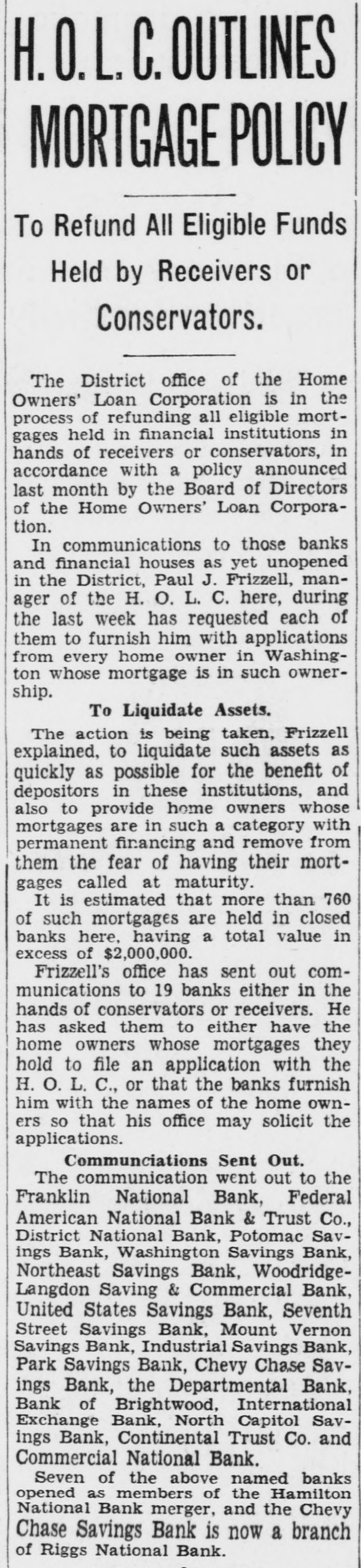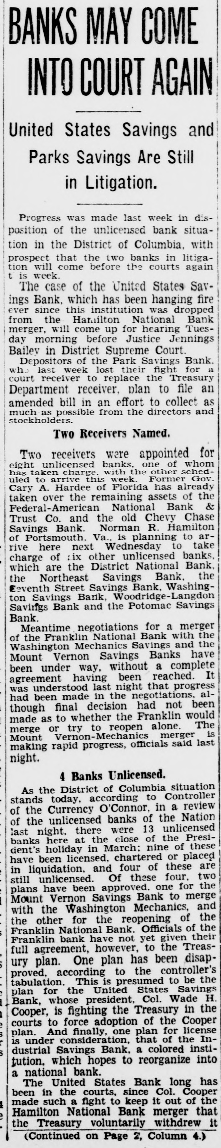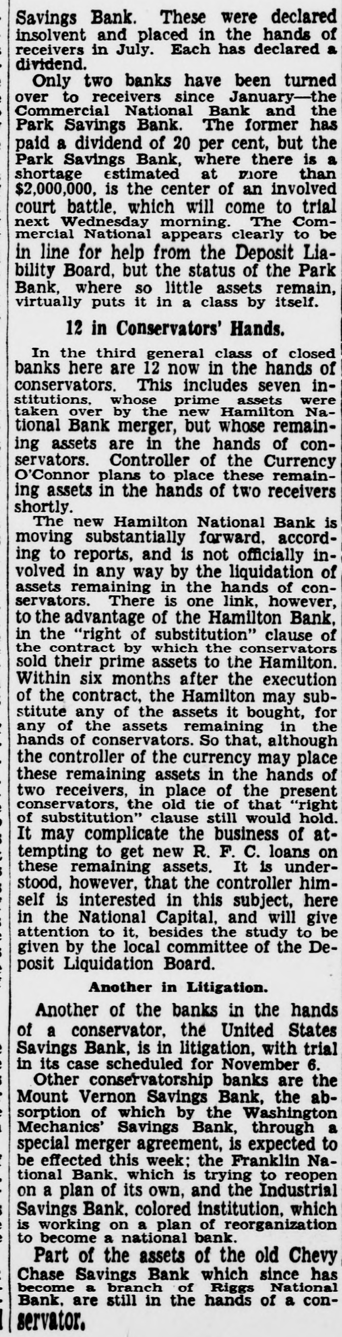REGAIN CONFIDENCE IN SAVINGS BANK Depositors Quit Line at Northeast Institution-New Accounts Opened. Following a number of withdrawals during the past two days at the North- H east Savings Bank, Eighth and streets, George F. Hoover, executive vice resident, said last night he had noted trend to re-establishment of confi- and dencé a in the soundness, strength safety of the bank when several people left the line and a number of new will accounts were opened. The bank Monbe ready for business as usual day morning, he announced. This bank is sound, safe, in a posi- to tion to pay everybody and intends "There do it," declared Mr. Hoover. is no reason whatever why people be unduly disturbed at rumors will be open as able to morning, and ness should We Monday usual be The for busi- bank take care of everybody. was open during the regular Saturday evening hours last night. Officers Are Unchanged. truckload of cash was delivered to A the bank yesterday from the Treasury Department. Just before the regular Mr. hour at noon yesterday depositclosing to assembled in ors no change has officers Hoover the that board explained of directors or been the made of the bank. He said the institution the full confidence of the Treashas ury Department and large downtown bankers. Northeast Savings Bank was The 16 years ago with a capitaliza- are Its total Sixty days ago, $1,000,000. tion founded of $100,000. resources Mr. Treas- Hooit was examined by in and ury ver said, Department found the to be excellent condition. Meantime, from the Mount Vernon and Bank, at Ninth street official Savings avenue, came an last night over the of W. Lee, president, to statement Massachusetts Frank leading signature offering reward "for information and conviction of spreading the $500 persons arrest damaging the Savings rumors person or concerning the Mount Vernon Bank. "Never in Better Condition." malicious and unfounded rumor has "A been spread througout the city, his statement. "and of the Government in the stability said some concerning particularly depart- of this which has uneasiness to some of our ments. institution. some naturally have Christ- deposi- caused those who bank. vacation savings in in to assure our tors, mas We wish and especially depositors the that particular. and the public at large, was the Mount Vernon Savings Bank in a better financial position never than at the present time. We are pre- our pared to meet every obligation and depositors need not feel the slightest funds concern for the safety of their held in their name in this bank. We strongly urge our depositors not their savings. in our bank than much to withdraw safer They put they away will are carried on the person. or the for be supposedly safekeeping about house. Vernon Savings Bank is and sound as the Rock raltar. as We have, can, and solid The Mount will of meet Gib- us All demands made upon have ask is that those we all served legitimate we can so well in the past institution. continue have confidence in our that to pledge our word and honor such We confidence will not be misplaced. Can Pay All Obligations. not listen to idle rumors. If in- in'Do is wanted concerning our stitution. formation its officers will gladly supply that Again we declare is on Mount request. Bank to it Vernon Savings pav the liquid. and in a position in full sound. all of its obligations on We demand trust this statement will reassure have those of our depositors who may rubecome disturbed over the malicious mors heretofore who have referred already to. withdrawn sugTo those and vacation savings, we bank, gest will be safe and where Christmas they they return them to the our available purpose when actually needed for acintended by the depositor when the count 'In closing, was large opened. we depositor desire to has say withdrawn that that not a single dollar from our bank except busineeded a in the ordinary conduct of ness. wish to take this opportunity to these to We our sincere appreciation and the express depositors for the support " given confidence displayed.