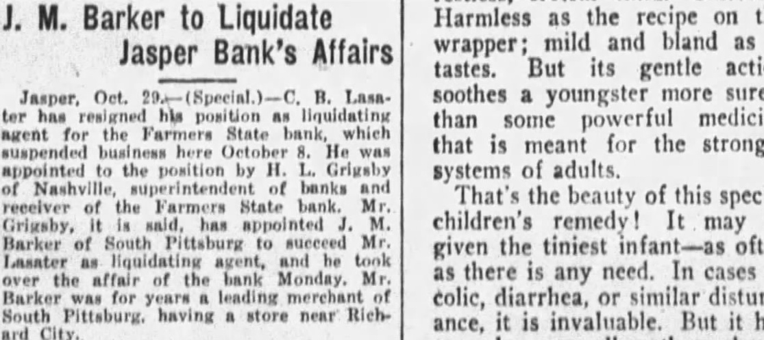 J. M. Barker to Liquidate Harmless as the recipe on the wrapper; mild and bland as it Jasper Bank's Affairs tastes. But its gentle action Jasper, Oct. 29.-(Special.) B. Lasa- soothes a youngster more surely ter has his position liquidating than some powerful medicine agent for the Farmers State bank, which that is meant for the stronger suspended here October He was appointed to the position by H. L. Grigsby systems of adults. of Nashville, superintendent of banks and That's the beauty of this special receiver of the Farmers State bank. Mr. Grigsby, it said, has appointed children's remedy! It may be Barker of South Pittsburg to succeed Mr. given the tiniest infant-as often Lasater as liquidating agent, and be took as there is any need. In cases of over the affair of the bank Monday. Mr. Barker for years leading of colic, diarrhea, or similar disturbSouth Pittsburg. having store near Richance, it is invaluable. But it has