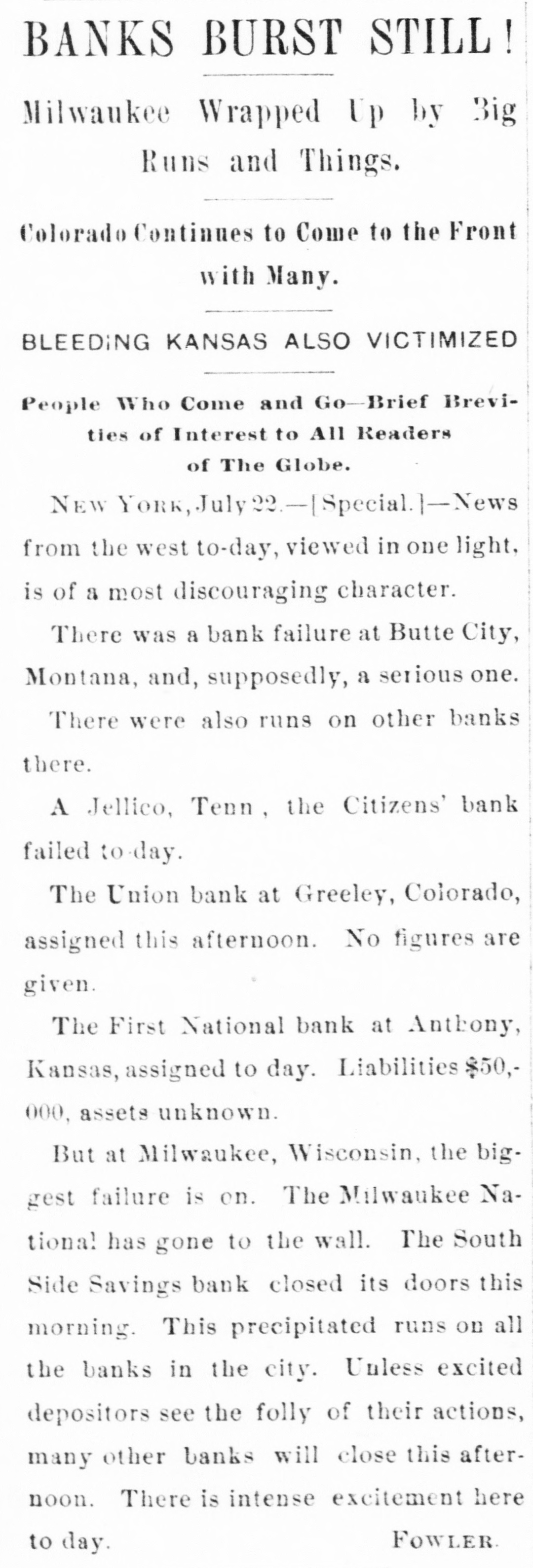 Also National Banks of Tennessee, Texas and Wisconsin Forced to the Wall. LOUISVILLE, KY., July 22.-The Kentucky National Bank, of this city, closed its doors this morning. The capital stock is $1,000,000. paid up. This bank is also a Government depository, and its last statement show $190,000 to the credit of the Government The loans and discounts outstanding amounted to $1,719,366, and the surplus was $108,500. It is thought that the bank will be able to resume business in a short time. It has been carrying an immense amount of paper, which, although gilt edge, could not be realized on. The bank is the Government depository, and in the statement of the bank. published July 19th, the Government's deposits are placed at $191,731. Deposits of the United States disbursing officers, $138,268. According to the statement, the amount of cash on hand July 19th was a little over $85,000, Individual deposits subject to check of $311,693. and the loans and discounts were $1,719,966. The bank got into serious trouble in the fall of 1890, by having very heavy deposits from the country banks. which were checked so rapidly as to threaten a suspension of the bank. It has never recovered from that trouble, and its failure has been expected for several months. No other banks are hurt. The Kentucky National Bank was a United States depository, and has Government deposits amounting to about $300,000, and its inability to make prompt transfers on this account was the immediate cause of the suspension to-day. During the past three years its surplus has been changed off from $300,000 to $100,000. The officers and directors do not expect to resume for some time, if at all, and it is generally thought that it will not resume at all, unless it should be entirely reorganized. ⑉ Bank Examiner Escott b-right authorizes the official statement that he has examined all the national banks in Louisville, and its vicinity, and they are all solvent. and most of them in very good condition. Future trouble is not expected, unless the small depositors, mainly Germans, become frightened over Sunday and start runs on the banks having large numbers of small depositors. KNOXVILLE, TENN July 22.-The State National Bank closed this morning after opening four minutes. notice was posted on the door saying: "This bank has closed for liquidation. Depositors will be paid in full. The State National Bank, of this city, closed its doors this morning. The bank has long been known to be the weakest in the city. Yesterday, when $20,000 in deposits were withdrawn. it was more than it could stand. A meeting of the directors was held last night. An offer of $40,000 to pay depositors should a run occur to-day was made by other banks. The offer was not accepted, however. When it opened for business this morning a run was precipitated, which only lasted a few minutes, as the bank closed its doors for liquidation. A notice on the door says it will pay depositors dollar for dollar. The stock holders will also receive 85 cents on the dollar. It was feared that the closing of the State National would cause a panic in Knoxville financial circles, which have heretofore been considered very strong. A slight run was only made on the City National Bank, which is just opposite the street, but depositors were paid in full. The scare was soon over. There is no more uneasiness felt here. LAMPASAS, TEX., July 22. The private banking house of J. & L W. Galbraith failed to open its doors yesterday, having made an assignment to Camp bell. Liabilities, $60,000; assets, $120,000. A run on the First National Bank was started, but it was fortunately in position to withstand all demands. The depositors in the Galbraiths' bank will be paid in full. DENVER, COL., July 22.-On petition of the General Electric Company, Judge Hallett, in the United States Court to-day appointed E. B. Shattuck, of Pueblo, receiver of the Pueblo City Railway Company and the International Trust Company. The liabilities of the company are placed at $700,000. VERNON, TEX. July 22.-The State National Bank or Vernon closed its doors yesterday. Every cent of money was paid out. except ten cents, before the doors were closed. The failure is due to the inability to realize on securities. The directors state that depositors will be paid in full. MILWAUKEE, WIS. July -The Milwaukee National Bank closed its doors this morning. MILWAUKEE, WIS., July 22.-The Southside Savings Bank did not open its doors this morning. TOPUKA, KAN., July -The First National Bank of Anthony closed its doors yesterday. Assets, $154,000; liabilities, $50,000. MEMPHIS, TENN., July 22.-The Citizens' Bank, of Jellico, Tenn., the only banking institution in that place, failed to open for business yesterday. GREELEY, COL. July 22. The Union Bank made an assignment yesterday. It is thought the step was voluntarily taken to avoid a contingency that might arise should some creditor take advantage of the attachment law. The bank is perfeetly solvent, and not one depositor will lose a dollar. RUSSELL KAN., July 22 The First National Bank, of this place, closed this afternoon, and was taken possession of by C. M. Sawyer, on the order of the Comptroller of the Currency. No statement is made. Run on a Homestead Bank. HOMESTEAD, PA., July 22.-A run of mada on the
