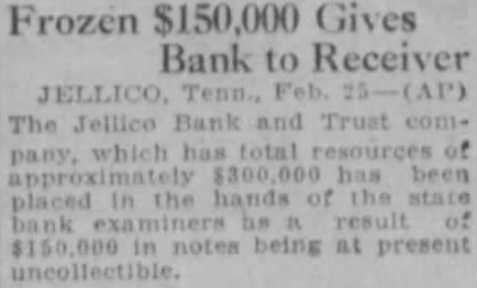 The Jellico Bank and Trust ... has been placed the hands of [a] receiver (article fragmented).; frozen $150,000 gives bank to receiver reported in paper date 1926-02-26
