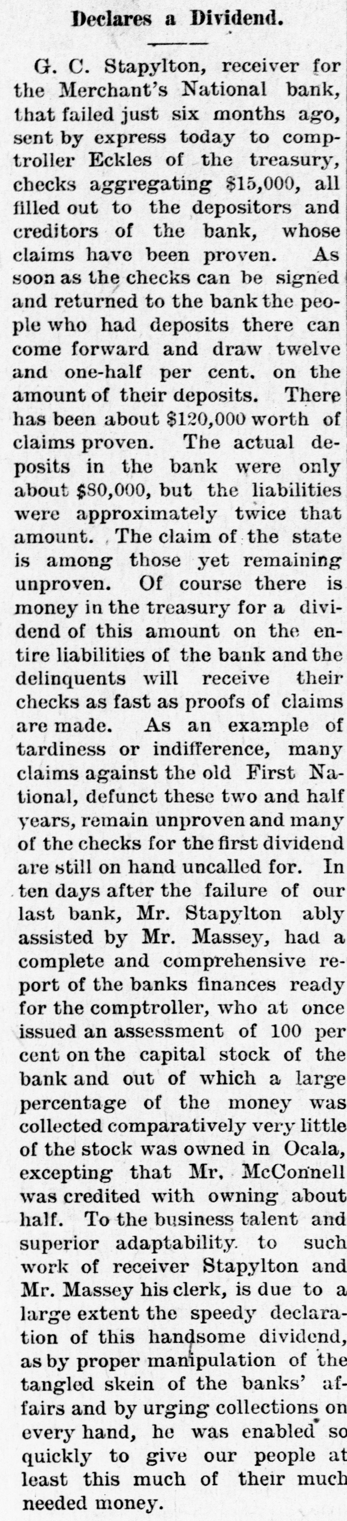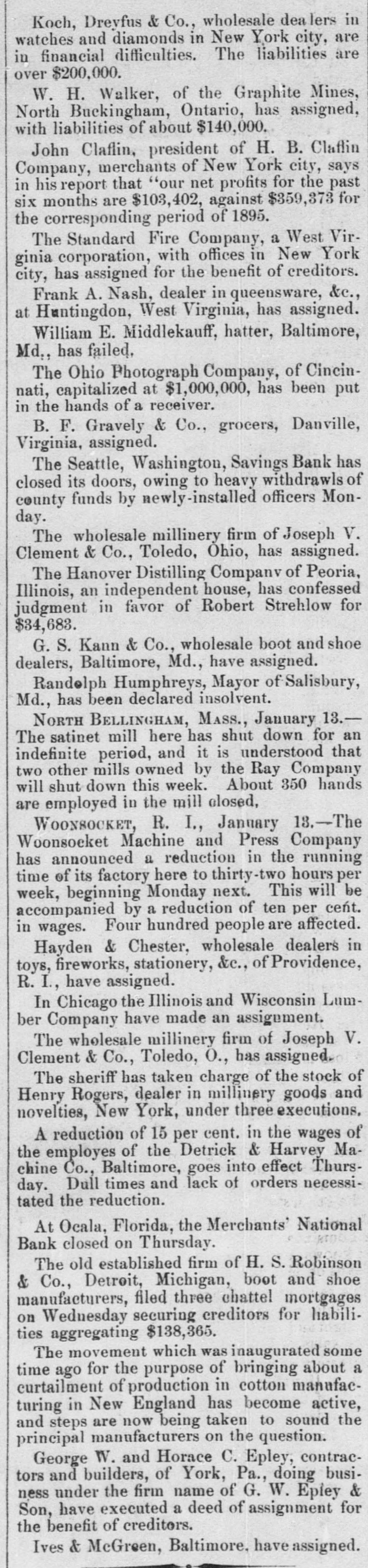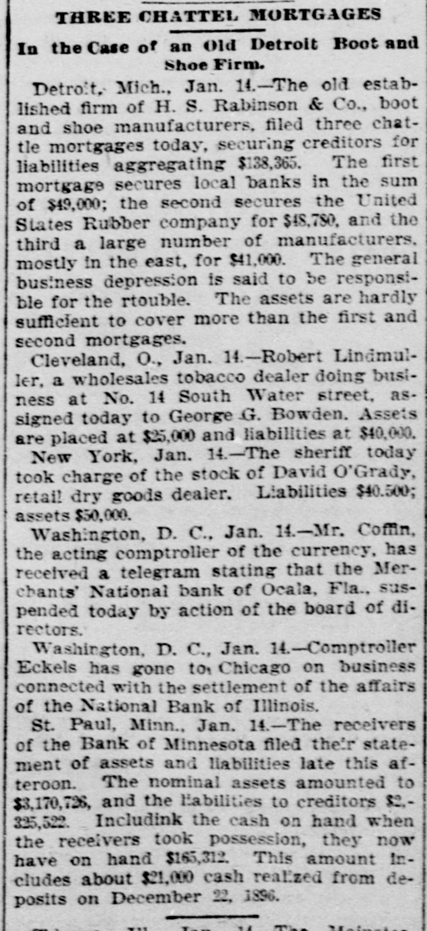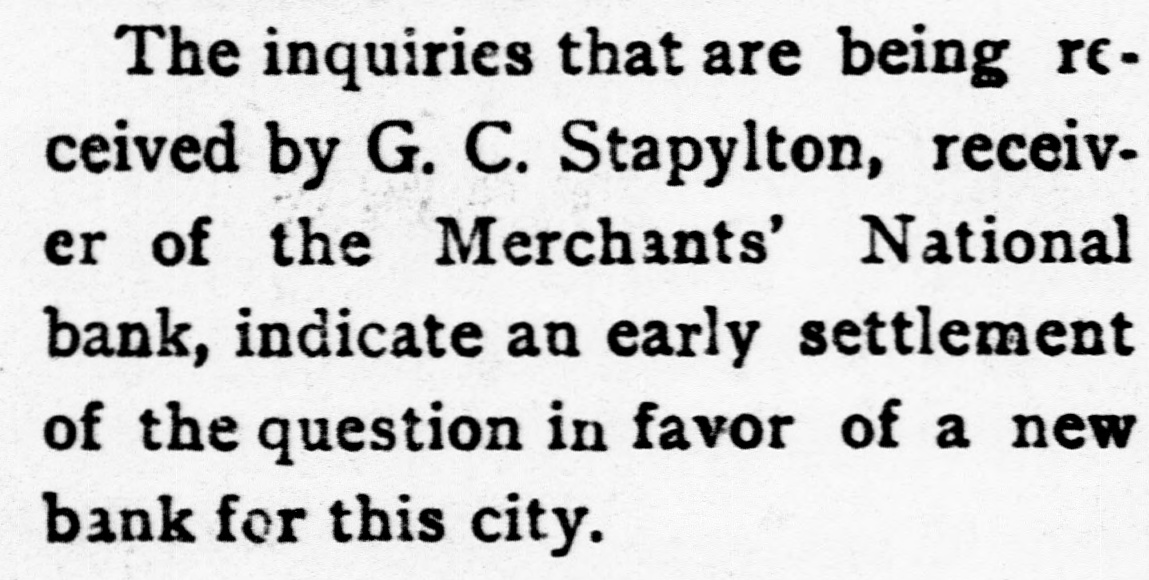 CLOSED THE DOORS. THE MERCHANTS' NATIONAL BANK OF THIS CITY SUCCUMBS TO THE FINANCIAL DEPRESSION. Our city was thrown into a state of great excitement this morning when it became known that the directors of the Merchants' National bank had decided not to open the doors. Soon after 8 o'clock the news began to spread and in a few minutes a large crowd had congregated in front of the bank discussing the situation and waiting anxiously for the usual opening hour. A few minutes before 9 o'clock a notice was placed on the door which read as follows: "Bank closed by order of directors, comptroller has been notified." This told the tale and the creditors knew that their worst fears had been realized. For some weeks it had been quietly rumored that the institution was in a very shaky condition and those who received the "tip" quietly withdrew their deposits. This has occasioned a steady run on the bank for the past three weeks. Yesterday a climax was reached. All day a steady rub was made and at night the withdrawals by local depositors during the day footel up over $12,000. This, together with the large amounts that had been drawn out, to use a plain expression, "busted the bank." The amount of deposits remaining in the bank is thought to be comparitively small, but nevertheless the blow i3 a severe one, The people of this community are not able to lose a cent in this way, and coming as it does, before we have recovered from the fearful crash of two years ago, the blow is doubly severe. What caused the failure at this time is a mystery. President McConnell is in New York trying to obtain assistance and his failure to get it is said to have forced the run yesterday. It is hoped the losses are not even as great as reported.