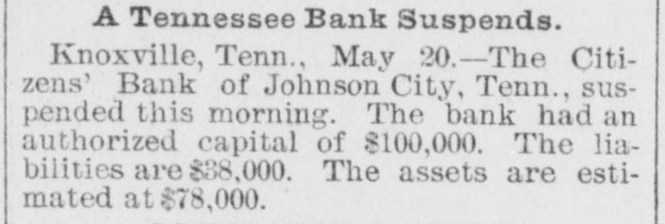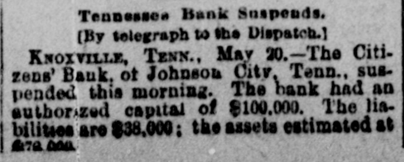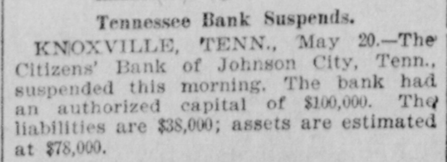 Tennessee Bank Suspends. (By telegraph to the Dispatch.) KNOXVILLE, TENN., May 20.-The Citizens' Bauk. of Johnson City, Tenn., suspended this morning. The bank had an authorized capital of $100,000. The liabilities are $38,000; the assets estimated at 4.79.000