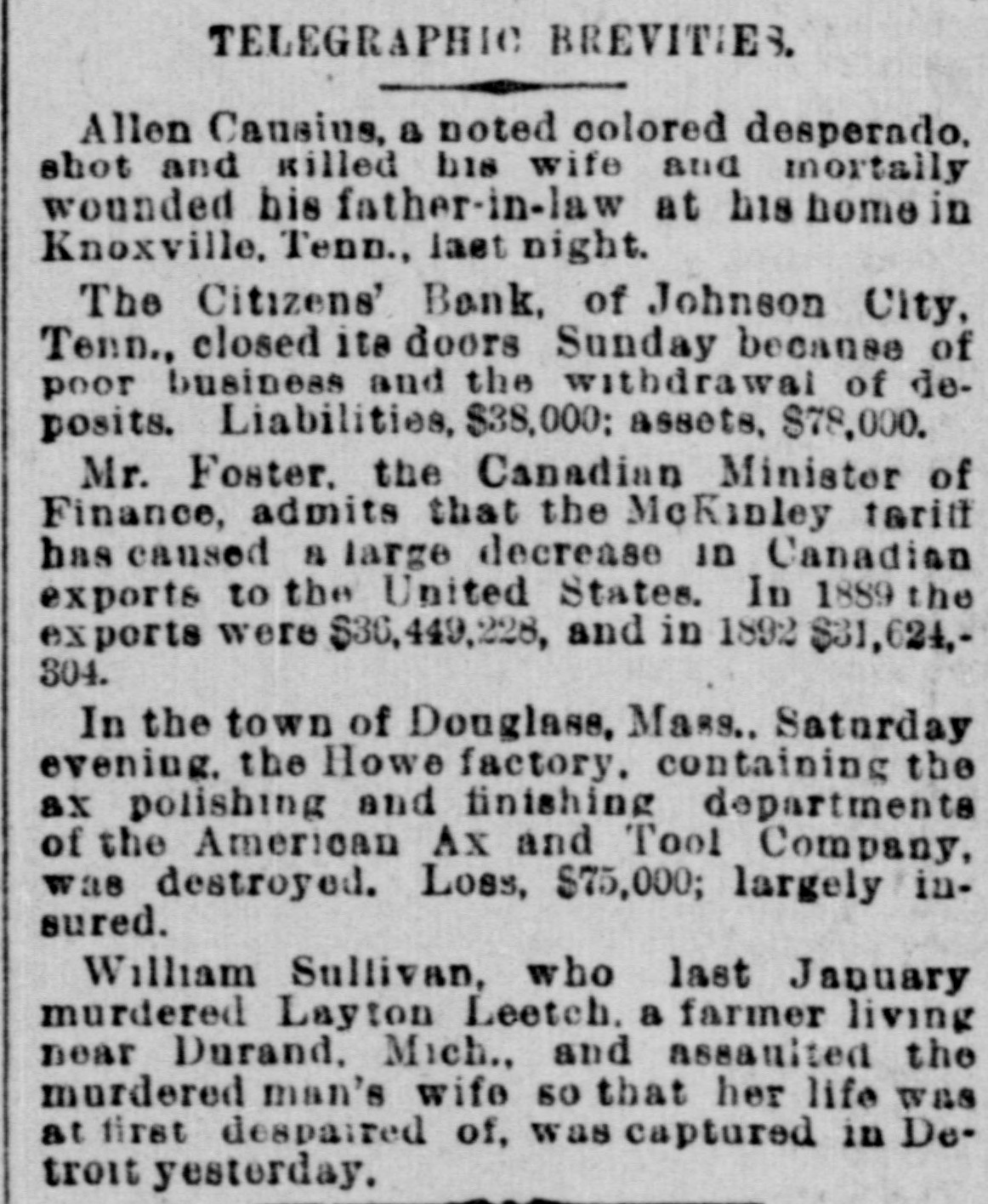 TELEGRAPHIC BREVITIES. Allen Causius, a noted colored desperado, shot and killed his wife and mortally wounded his father-in-law at his home in Knoxville, Tenn., laet night. The Citizens' Bank, of Johnson City, Tenn., closed its doors Sunday because of poor business and the withdrawal of deposits. Liabilities, $38,000; assets, $78,000. Mr. Foster. the Canadian Minister of Finance, admits that the McKinley tariff has caused a large decrease in Canadian exports to the United States. In 1889 the exports were $36,449,228, and in 1892 $31,624,304. In the town of Douglase, Mass.. Saturday evening. the Howe factory. containing the ax polishing and finishing departments of the American Ax and Tool Company, was destroyed. Loss, $75,000; largely insured. William Sullivan, who last January murdered Layton Leetch. a farmer living near Durand, Mich., and assaulted the murdered man's wife so that her life was at first despaired of, was captured in Detroit yesterday.