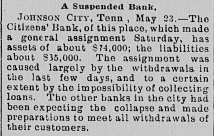 A Suspended Bank, JOHNSON City, Tenn, May 23.-The Citizens' Bank, of this place, which made a general assignment Saturday, has assets of about $74,000; the liabilities about $35,000. The assignment was caused largely by the withdrawals in the last few days, and to a certain extent by the impossibility of collecting loans. The other banks in the city had been expecting the collapse and made preparations to meet all withdrawals of their customers.