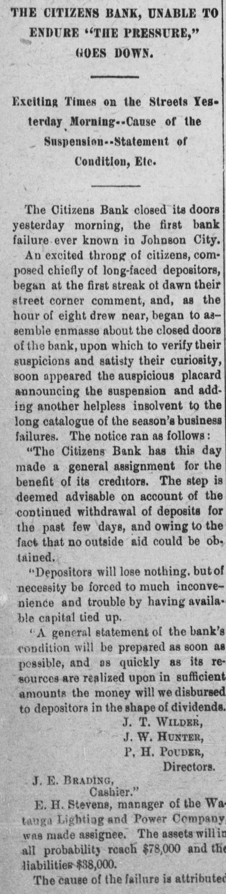 THE CITIZENS BANK, UNABLE TO ENDURE "THE PRESSURE," GOES DOWN. Exciting Times on the Streets Yesterday Morning--Cause of the Suspension-- Statement of Condition, Etc. The Citizens Bank closed its doors yesterday morning, the first bank failure ever known in Johnson City. An excited throng of citizens, composed chiefly of long-faced depositors, began at the first streak of dawn their street corner comment, and, as the hour of eight drew near, began to assemble enmasse about the closed doors of the bank, upon which to verify their suspicions and satisty their curiosity, soon appeared the auspicious placard announcing the suspension and adding another helpless insolvent to the long catalogue of the season's business failures. The notice ran as follows: "The Citizens Bank has this day made a general assignment for the benefit of its creditors. The step is deemed advisable on account of the continued withdrawal of deposits for the past few days, and owing to the fact that no outside aid could be ob. tained. "Depositors will lose nothing. but of necessity be forced to much inconvenience and trouble by having available capital tied up. "A general statement of the bank's condition will be prepared as soon as possible, and as quickly as its resources are realized upon in sufficient amounts the money will we disbursed to depositora in the shape of dividends. J. T. WILDER, J. W. HUNTER, P, H. POUDER, Directors. J. E. BRADING, Cashier." E. H. Stevens, manager of the Wa tauga Lighting and Power Company was made assignee. The assets will in all probability reach $78,000 and the liabilities $38,000. The cause of the failure is attributed