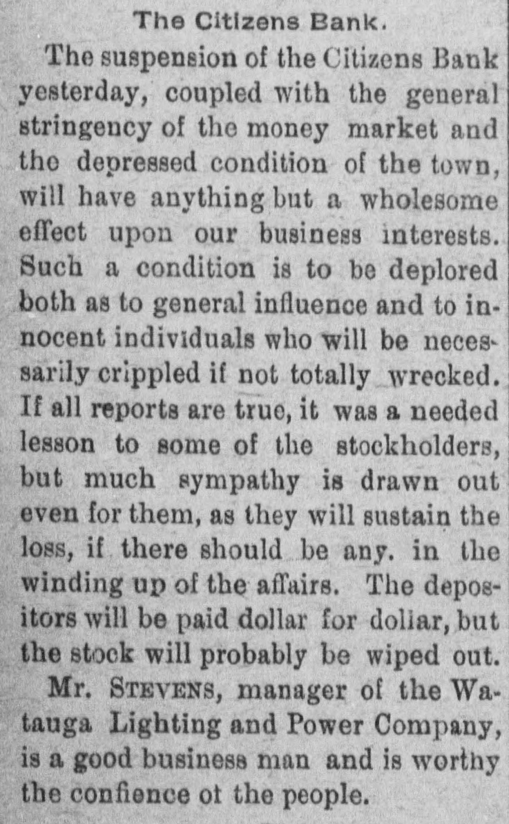 The Citizens Bank. The suspension of the Citizens Bank yesterday, coupled with the general stringency of the money market and the depressed condition of the town, will have anything but a wholesome effect upon our business interests. Such a condition is to be deplored both as to general influence and to innocent individuals who will be necessarily crippled if not totally wrecked. If all reports are true, it was a needed lesson to some of the stockholders, but much sympathy is drawn out even for them, as they will sustain the loss, if there should be any. in the winding up of the affairs. The depositors will be paid dollar for dollar, but the stock will probably be wiped out. Mr. STEVENS, manager of the Watauga Lighting and Power Company, is a good business man and is worthy the confience ot the people.