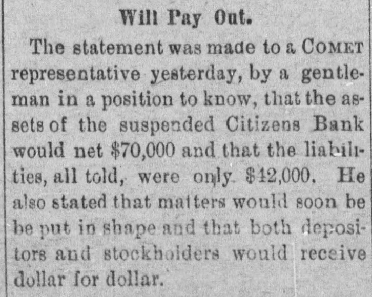 # Will Pay Out. The statement was made to a COMET representative yesterday, by a gentleman in a position to know, that the assets of the suspended Citizens Bank would net $70,000 and that the liabilities, all told, were only $12,000. He also stated that matters would soon be be put in shape and that both depositors and stockholders would receive dollar for dollar.