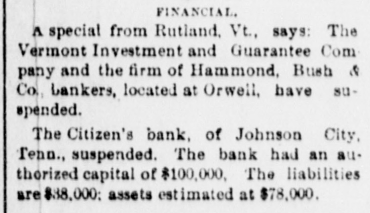 FINANCIAL A special from Rutland, Vt., says: The Vermont Investment and Guarantee Com pany and the firm of Hammond, Bush & Co. bankers, located at Orwell, have suspended. The Citizen's bank, of Johnson City, Tenn., suspended. The bank had an au thorized capital of $100,000, The liabilities are$38,000; assets estimated at $78,000.
