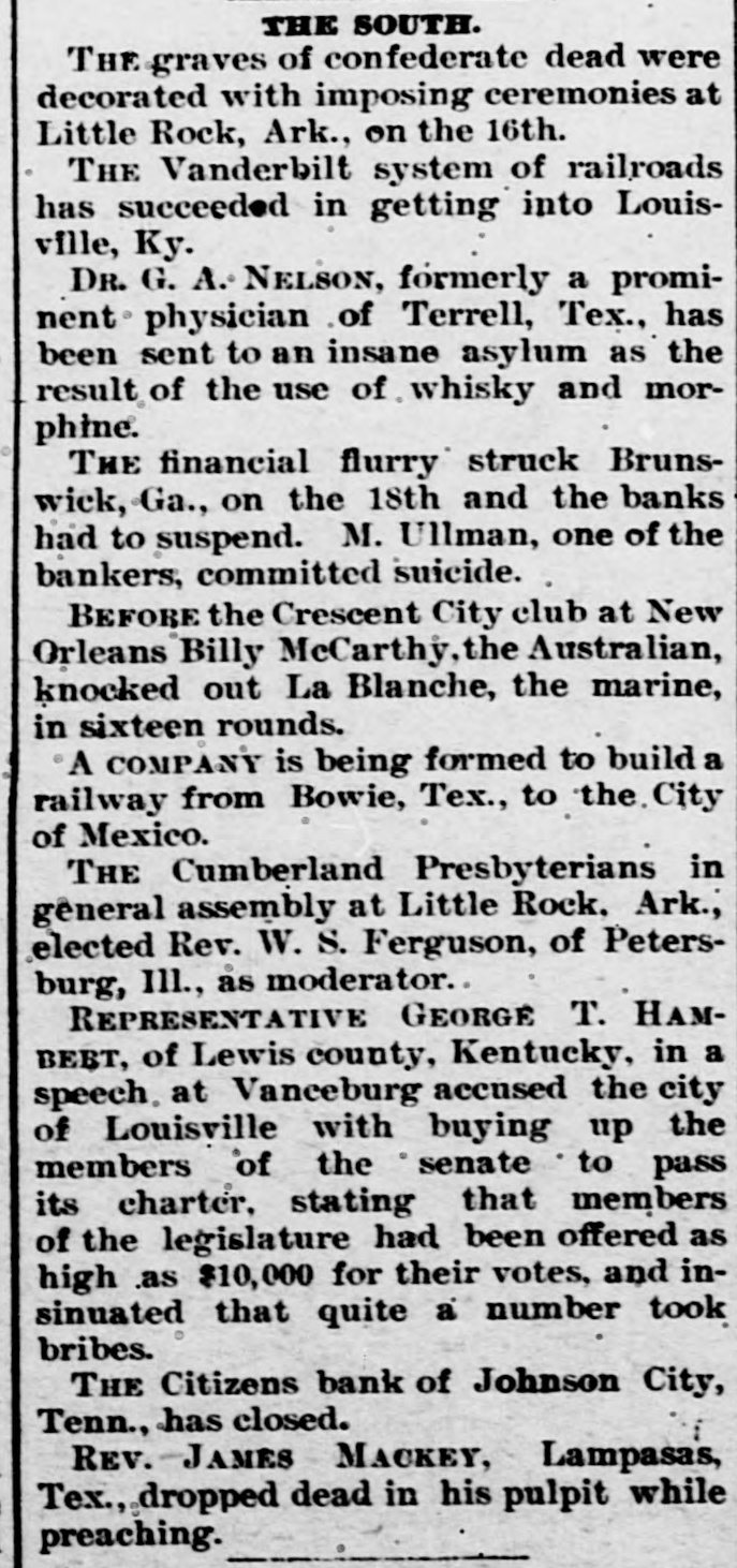 THE SOUTH. THE graves of confederate dead were decorated with imposing ceremonies at Little Rock, Ark., on the 16th. THE Vanderbilt system of railroads has succeeded in getting into Louisville, Ky. DR. G. A. NELSON, formerly a prominent physician of Terrell, Tex., has been sent to an insane asylum as the result of the use of whisky and morphine. THE financial flurry struck Brunswick, Ga., on the 18th and the banks had to suspend. M. Ullman, one of the bankers, committed suicide. BEFORE the Crescent City club at New Orleans Billy McCarthy, the Australian, knocked out La Blanche, the marine, in sixteen rounds. A COMPANY is being formed to build a railway from Bowie, Tex., to the. City of Mexico. THE Cumberland Presbyterians in géneral assembly at Little Rock. Ark., elected Rev. W. S. Ferguson, of Petersburg, Ill., as moderator. REPRESENTATIVE GEORGE T. HAMBEET, of Lewis county, Kentucky, in a speech. at Vanceburg accused the city of Louisville with buying up the members of the senate to pass its charter, stating that members of the legislature had been offered as high as $10,000 for their votes, and insinuated that quite a number took bribes. THE Citizens bank of Johnson City, Tenn., has closed. REV. JAMES MACKEY, Lampasas, Tex. dropped dead in his pulpit while preaching.