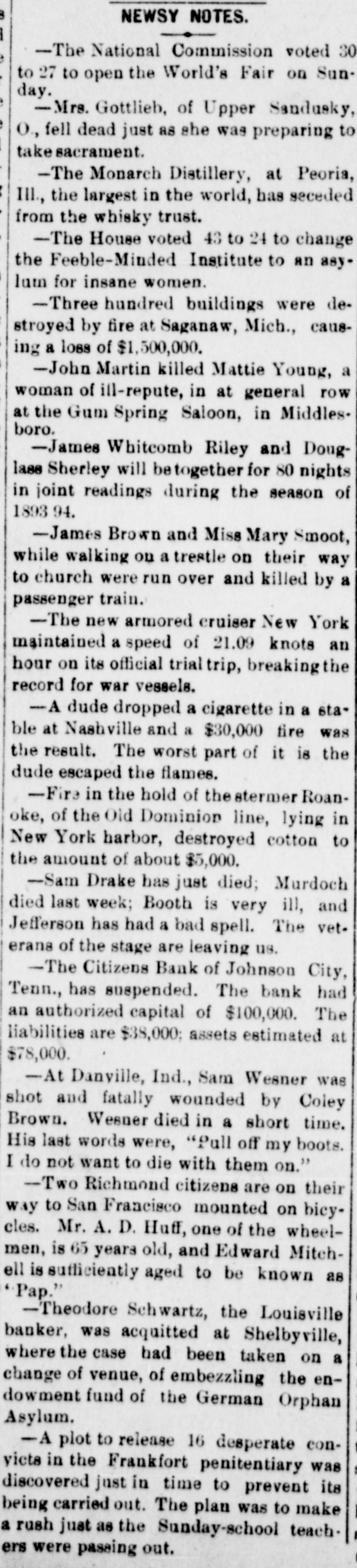 8 NEWSY NOTES. -The National Commission voted 30 to 27 to open the World's Fair on Sunday. -Mrs. Gottlieb, of Upper Sandusky, O., fell dead just as she was preparing to take sacrament. -The Monarch Distillery, at Peoria, III., the largest in the world, has seceded from the whisky trust. -The House voted 43 to 24 to change the Feeble-Minded Institute to an asylum for insane women. -Three hundred buildings were destroyed by fire at Saganaw, Mich., causing a loss of $1,500,000. -John Martin killed Mattie Young, a woman of ill-repute, in at general row at the Gum Spring Saloon, in Middlesboro. -James Whitcomb Riley and Douglase Sherley will betogether for 80 nights in joint readings during the season of 1893 94. -James Brown and Miss Mary Smoot, while walking on a trestle on their way to church were run over and killed by a passenger train. -The new armored cruiser New York maintained a speed of 21.09 knots an hour on its official trial trip, breaking the record for war vessels. -A dude dropped a cigarette in a stable at Nashville and a $30,000 fire was the result. The worst part of it is the dude escaped the flames. -Fire in the hold of the stermer Roanoke, of the Old Dominion line, lying in New York harbor, destroyed cotton to the amount of about $5,000. -Sam Drake has just died; Murdoch died last week; Booth is very ill, and Jefferson has had a bad spell. The veterans of the stage are leaving us. -The Citizens Bank of Johnson City, Tenn., has suspended. The bank had an authorized capital of $100,000. The liabilities are $38,000; assets estimated at $78,000. -At Danville, Ind., Sam Wesner was shot and fatally wounded by Coley Brown. Wesner died in a short time. His last words were, "Pull off my boots. I do not want to die with them on." -Two Richmond citizens are on their WAY to San Francisco mounted on bicyeles. Mr. A. D. Huff, one of the wheelmen, is 65 years old, and Edward Mitchell is sufficiently aged to be known as Pap." -Theodore Schwartz, the Louisville banker, was acquitted at Shelbyville, where the case had been taken on a change of venue, of embezzling the endowment fund of the German Orphan Asylum. -A plot to release 16 desperate convicta in the Frankfort penitentiary was discovered just in time to prevent its being carried out. The plan was to make a rush just as the Sunday-school teachers were passing out.