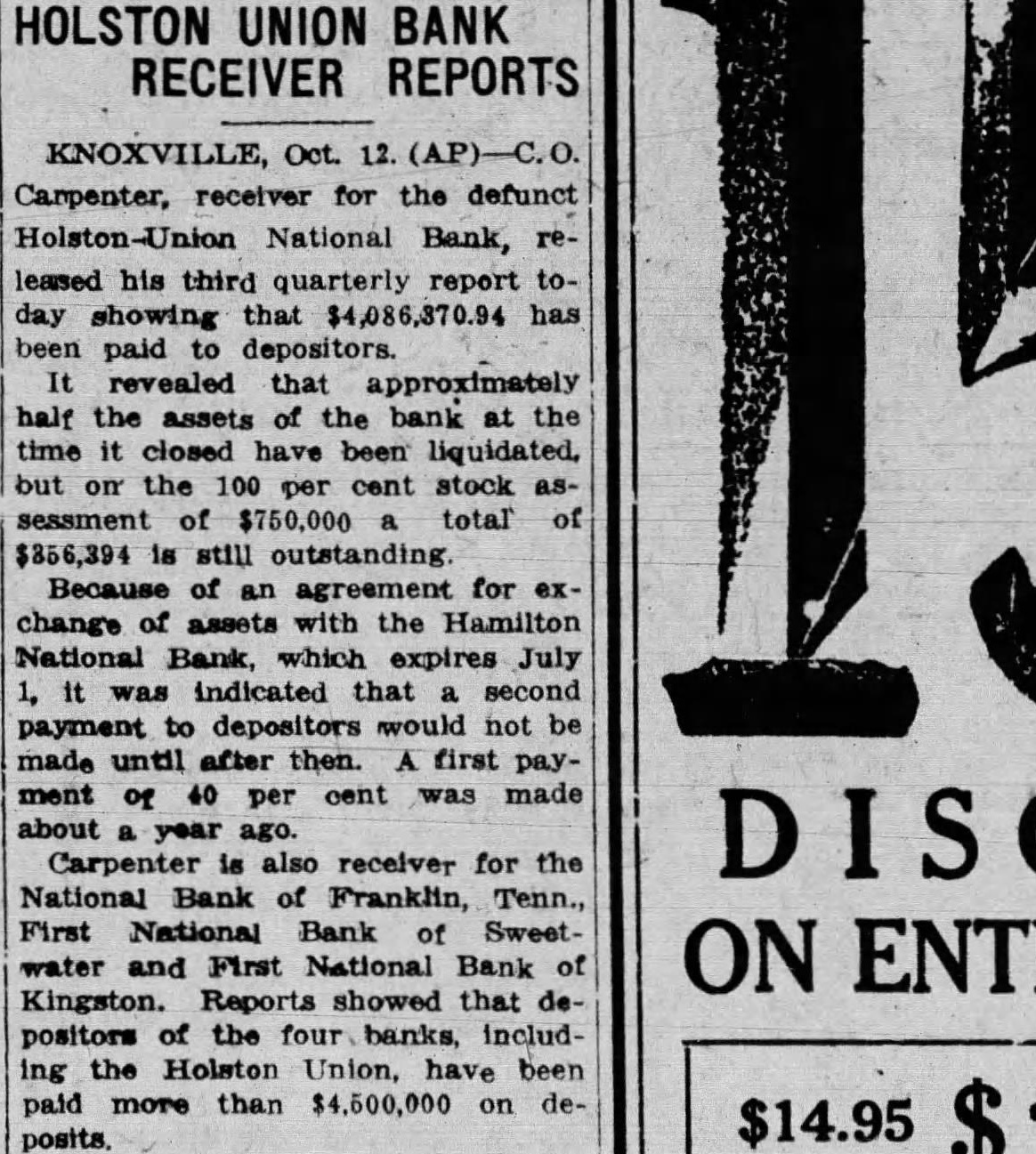 KNOXVILLE, Oct. 12. Carpenter, receiver for the defunct Holston-Union National Bank, released his third quarterly report today showing that $4,086,370.94 has been paid to depositors. It revealed that approximately half the assets of the bank at the time it closed have been liquidated. but on the 100 per cent stock assessment of $750,000 total of $356,394 is still outstanding Because of an agreement for exchange assets with the Hamilton National Bank, which expires July 1, it was indicated that second payment to depositors would not be made until after then. A. first payment of 40 per cent was made about year ago. Carpenter is also receiver for the National Bank of Franklin, Tenn., First National Bank of Sweetwater and First National Bank of Kingston. Reports showed that depositors of the four banks, including the Holston Union, have been paid more than $4,500,000 on de$14.95 posits.