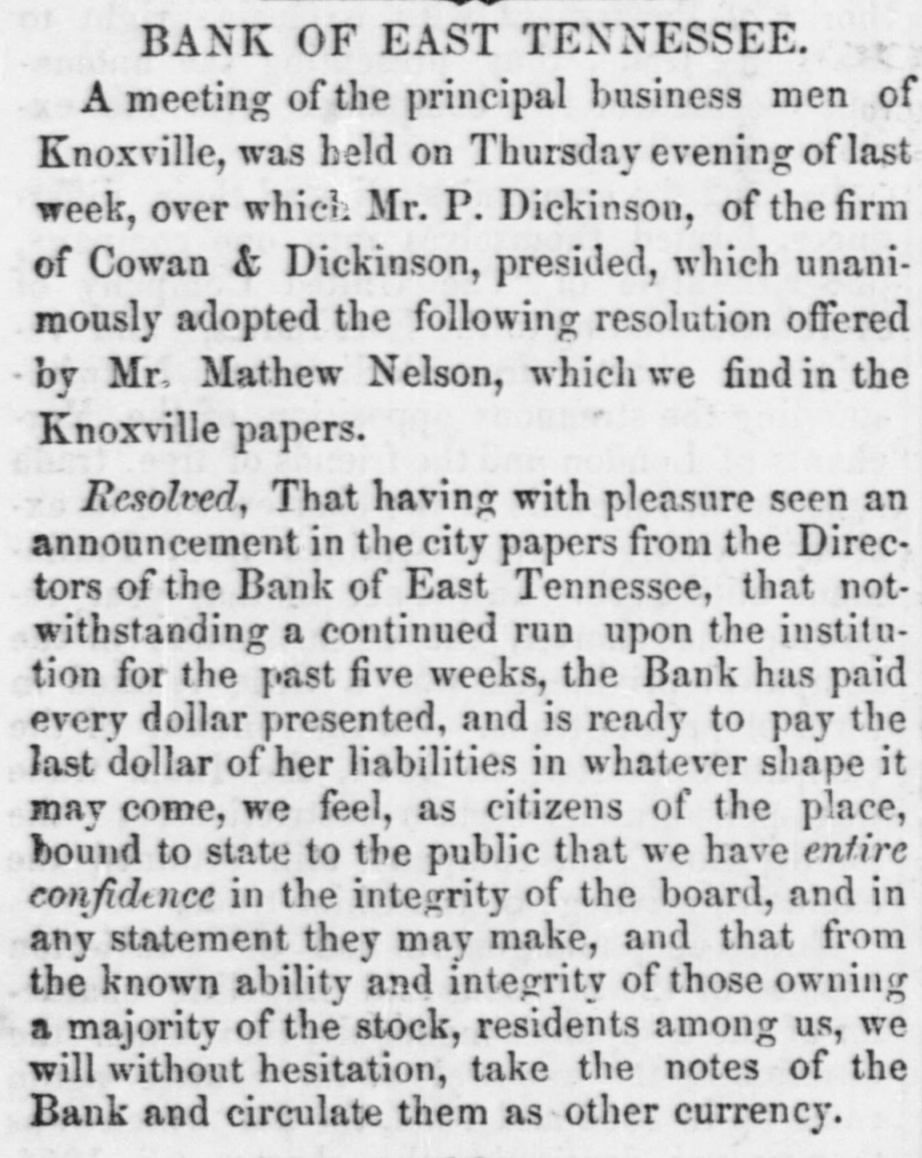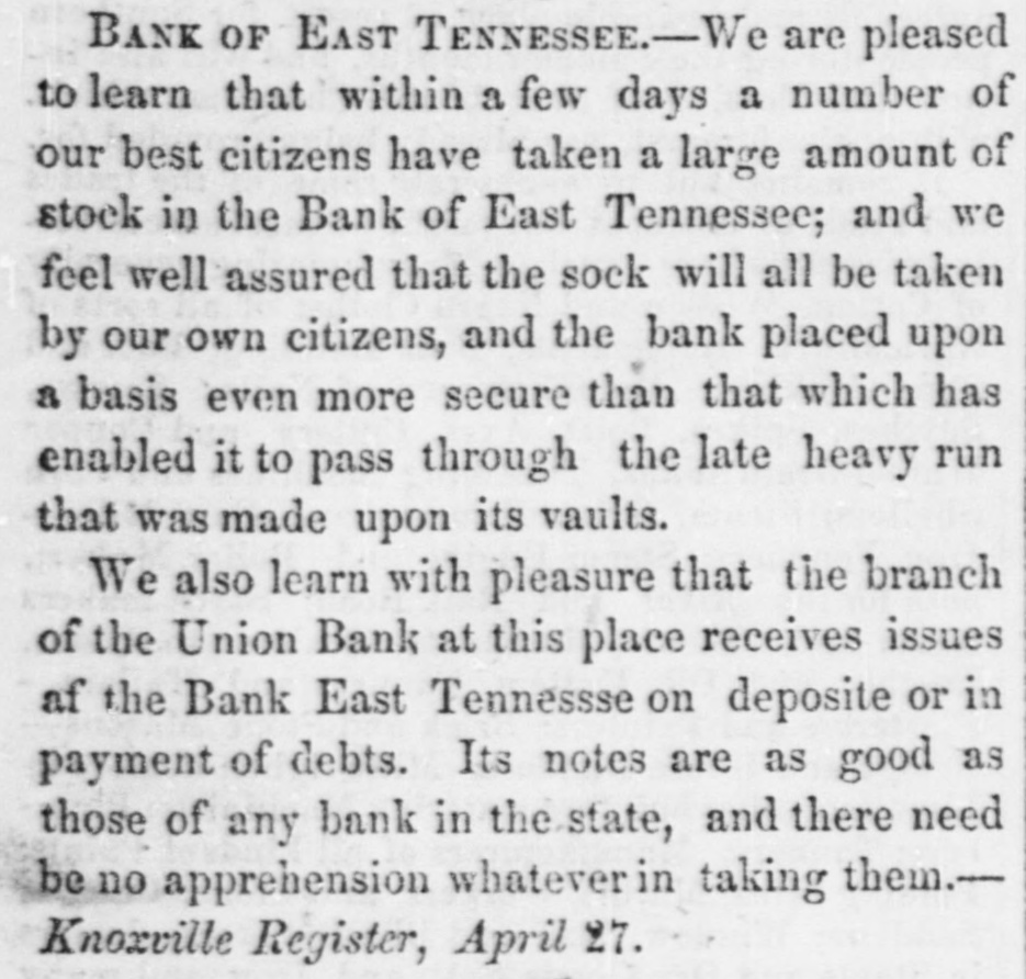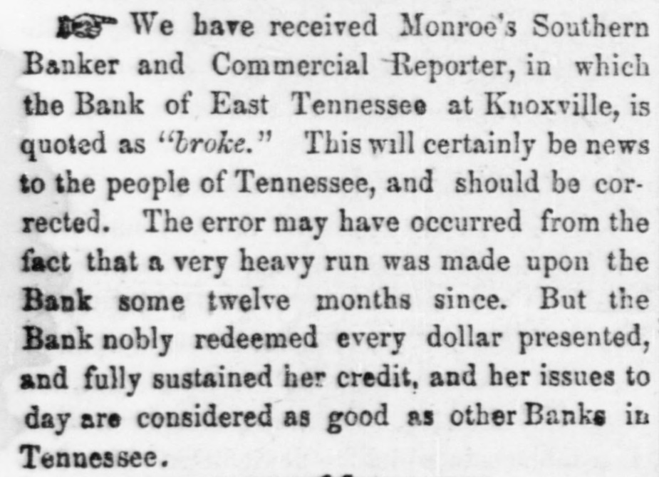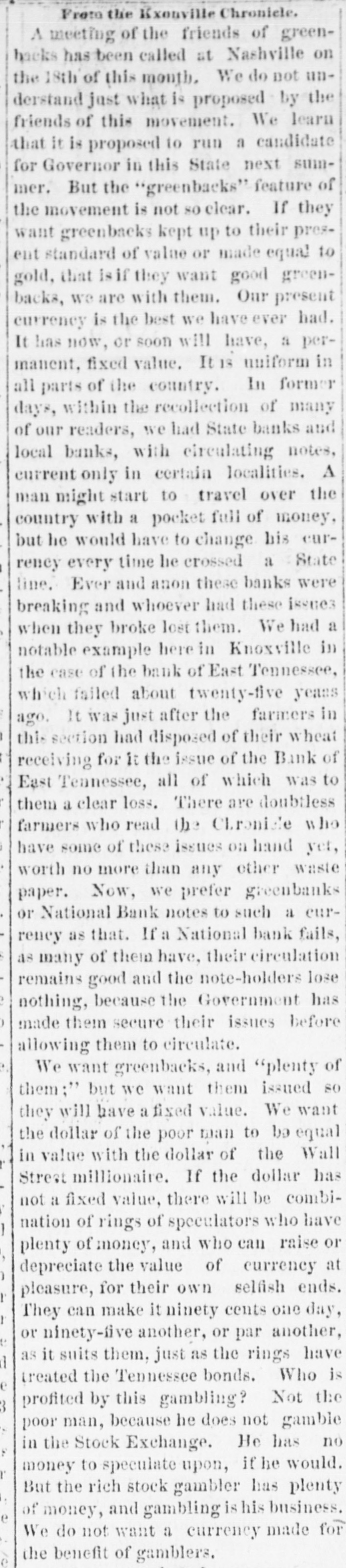 From the Kxonville Chroniele. A meeting of the friends of greenbacks has been called at Nashville on the 18th of this month, We do not understand just what is proposed by the friends of this movement. We learn that it is proposed to run a candidate for Governor in this State next summer. But the "greenbacks" feature of the movement is not 80 clear. If they want greenbacks kept up to their present standard of value or made equal to gold, that isif they want good greenbacks, we are with them. Our present currency is the best we have ever had. It has now, or soon will have, a permanent, fixed value. It is uniform in all parts of the country. In former days, within the recollection of many of our readers, we had State banks and local banks, with circulating notes, current only in certain localities. A man might start to travel over the country with a pocket full of money, but he would have to change his currency every time he crossed a State line. Ever and anon these banks were breaking and whoever had these issues when they broke lost them. We had a notable example here in Knoxville in the case of the bank of East Tennessee, which failed about twenty-five years ago, It was just after the farmers in this section had disposed of their wheat receiving for It the issue of the Bank of East Tennessee, all of which was to them a clear loss. There are doubtless farmers who read the Chronicle who have some of these issues on hand yet, worth no more than any other waste paper. Now, we prefer greenbanks or National Bank notes to such a currency as that. If a National bank fails, as many of them have, their circulation remains good and the note-holders lose nothing, because the Government has made them secure their issues before allowing them to circulate. We want greenbacks, and "plenty of them;" but we want them issued so they will have a fixed value. We want the dollar of the poor man to be equal in value with the dollar of the Wall Street millionaire. If the dollar has not a fixed value, there will be combination of rings of speculators who have plenty of money, and who can raise or depreciate the value of currency at pleasure, for their own selfish ends. They can make it ninety cents one day, or ninety-five another, or par another, as it suits them, just as the rings have treated the Tennessee bonds. Who is profited by this gambling? Not the poor man, because he does not gamble in the Stock Exchange. He has no money to speculate upon, if he would. But the rich stock gambler has plenty of money, and gambling is his business. We do not want a currency made for