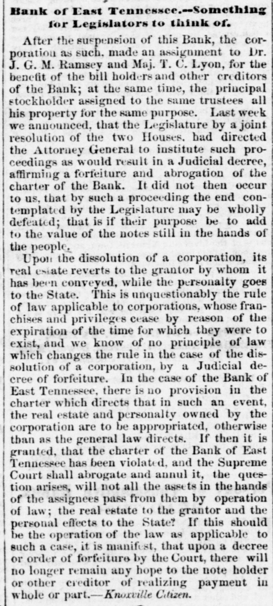 Bank of East Tennessee.--Something for Legislators to think of. After the suspension of this Bank, the corporation as such. made an assignment to Dr. J. G. M. Ramsey and Maj. T. C. Lyon, for the benefit of the bill holders and other creditors of the Bank; at the same time, the principal stockholder assigned to the same trustees all his property for the same purpose. Last week we announced, that the Legislature by a joint resolution of the two Houses. had directed the Attorney General to institute such proceedings as would result in a Judicial decree, affirming a forfeiture and abrogation of the charter of the Bank. It did not then occur to us, that by such a proceeding the end contemplated by the Legislature may be wholly defeated; that is if their purpose be to add to the value of the notes still in the hands of the people. Upon the dissolution of a corporation, its real estate reverts to the grantor by whom it has been conveyed, while the personalty goes to the State. This is unquestionably the rule of law applicable to corporations, whose franchises and privileges cease by reason of the expiration of the time for which they were to exist, and we know of no principle of law which changes the rule in the case of the dissolution of a corporation, by a Judicial decree of forfeiture. In the case of the Bank of East Tennessee, there is no provision in the charter which directs that in such an event, the real estate and personalty owned by the corporation are to be appropriated, otherwise than as the general law directs. If then it is granted, that the charter of the Bank of East Tennessee has been violated, and the Supreme Court shall abrogate and annul it, the question arises, will not all the assets in the hands of the assignees pass from them by operation of law; the real estate to the grantor and the personal effects to the State? If this should be the operation of the law as applicable to such a case, it is manifest, that upon a decree or order of forfeiture by the Court, there will no longer remain any hope to the note holder or other creditor of realizing payment in whole or part.-Knoxville Citizen.