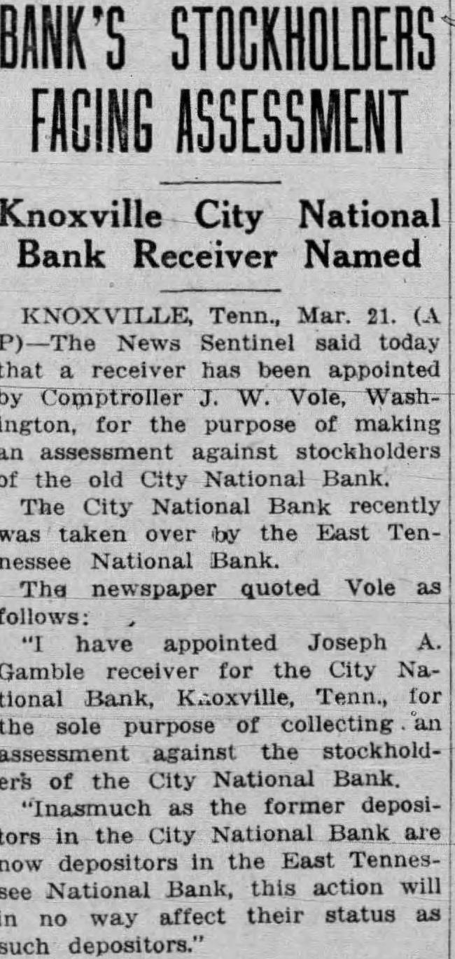KNOXVILLE, Tenn., Mar. 21. (A News Sentinel said today that receiver has been appointed by Comptroller W. Vole, Washington, for the purpose of making an against stockholders of the old City National Bank. The City National Bank recently was taken by the East Tennessee National Bank. The newspaper quoted Vole as follows: have appointed Joseph A. Gamble receiver for the City National Bank, Knoxville, Tenn., for the sole purpose of collecting an against the stockholders of the City National Bank. "Inasmuch the former depositors in the City National Bank are now depositors in the East Tennessee National Bank, this action will in no way affect their status as such depositors."