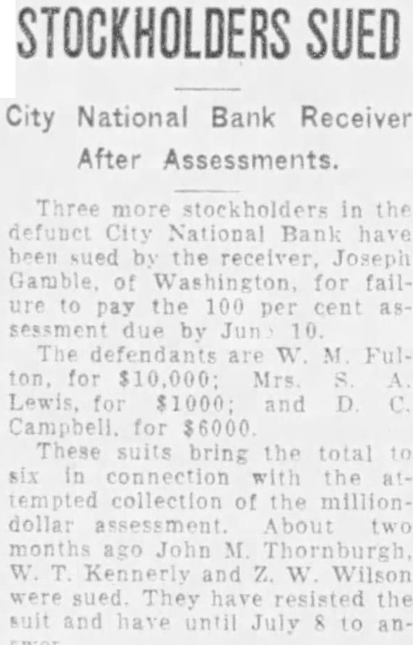 Three more stockholders in the defunct City National Bank have been sued by the receiver, Joseph Gamble of Washington, for failure to pay the 100 per cent assessment due by Jun 10. The defendants are W M FulLewis, for $1000: and D Campbell. for $6000 These suits bring the total to six in connection with the tempted collection of the milliondollar assessment About two months ago John M Thornburgh Kennerly and Z. W Wilson were sued They have resisted the and have until July 8 to an-