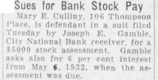 Mary Culliny 106 Thompson Place. is defendant in suit filed Tuesday by Joseph E. Gamble, City National Bank receiver, for $5000 stock Gamble asks also for per interest from May 1932. when the as. sessment was due.