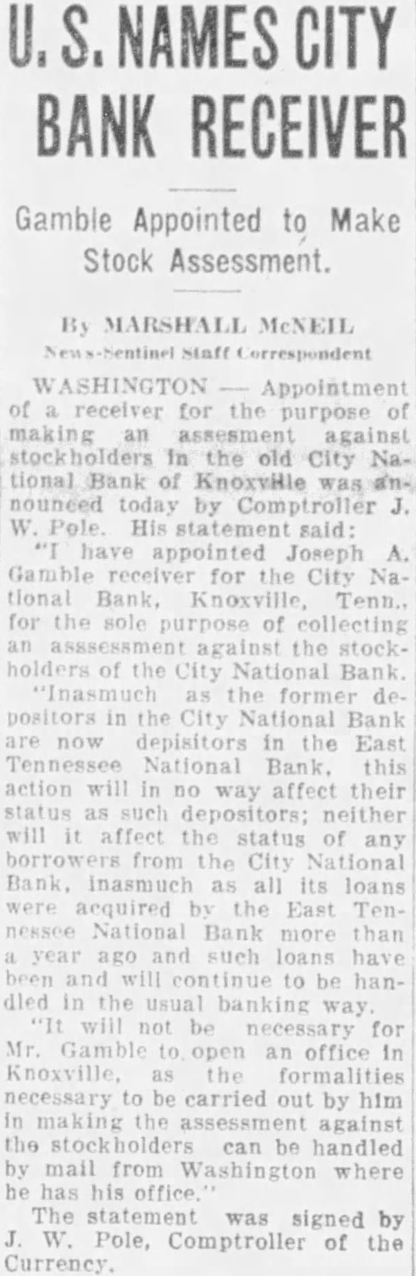 ASHINGTON Appointment of receiver the purpose of making assesment against in the old City tional Bank of KnoxyHle was nouneed today by Pole His statement said: have appointed Joseph Gamble receiver for the City Nafor the sole purpose of collecting the stockholders of the City National Bank "Inasmuch former positors in City National Bank now depisitors the East Tennessee National Bank. this action will in way affect their depositors: neither will affect status of any from the City National Bank inasmuch all its loans acquired the East Tennessee National Bank year such loans have to died in the banking way not necessary for Mr. Gamble open an office Knoxville as necessary to carried out by him the against the can be handled by mail from Washington where he has his The was signed by Pole, Comptroller of the Currency