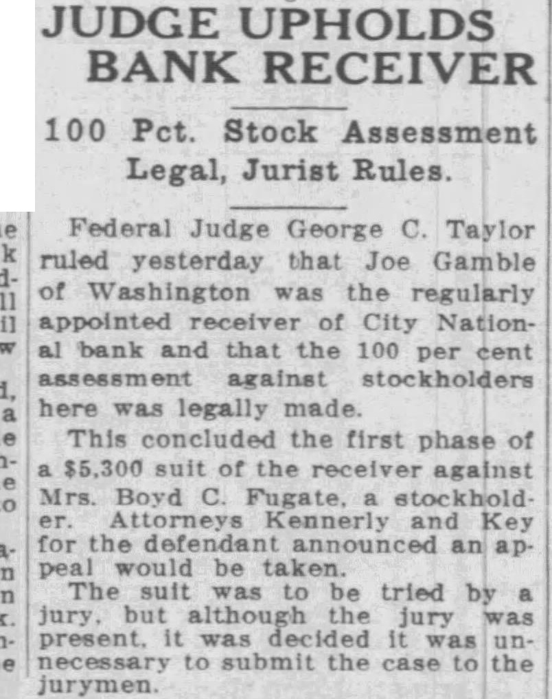 Federal Judge George C. ruled yesterday that Joe Gamble of Washington the regularly appointed receiver of City Nationbank and that the 100 per cent assessment against stockholders here legally made. This concluded the first phase of $5,300 suit of the against Mrs. Boyd Attorneys Kennerly Key for the defendant announced peal would be taken. The suit was be tried by jury, but jury was was decided necessary to submit the case jurymen.