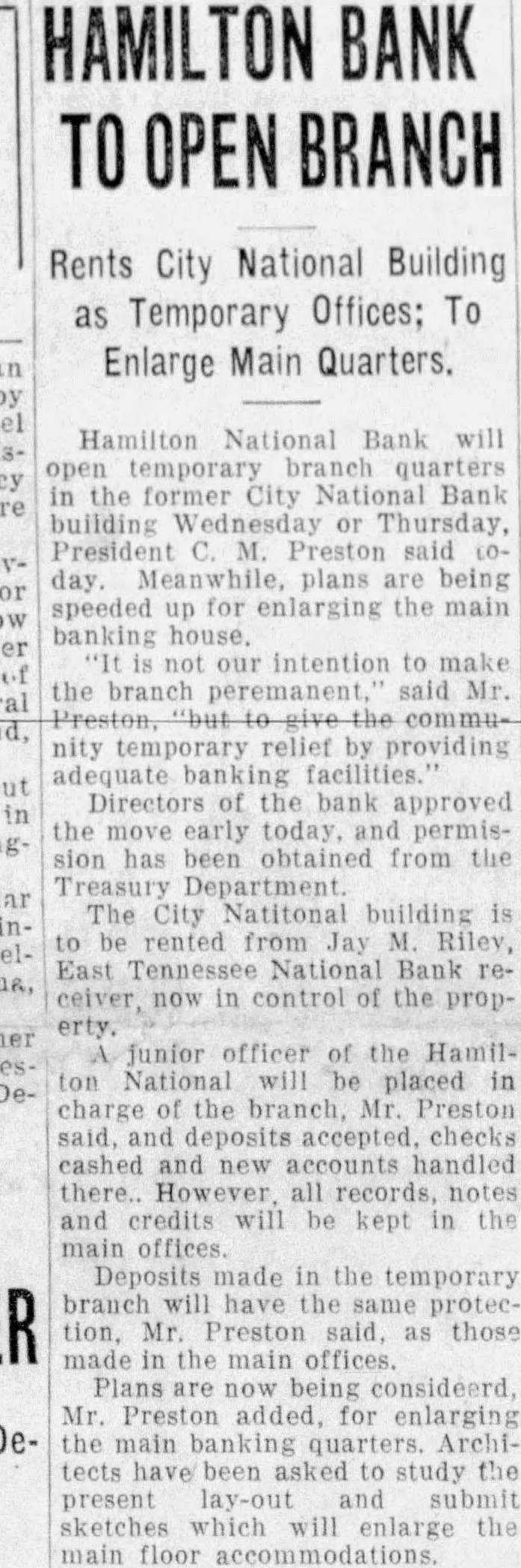 Hamilton National Bank will open temporary quarters the former City National Bank building Thursday, President M. Preston said day. Meanwhile, plans are being speeded up for enlarging the main banking not our intention to make the branch peremanent, said Mr. nity temporary relief by providing adequate facilities Directors of the bank approved the move early today permishas been obtained from the Department. The City Natitonal building is be rented from Jay Riley, East Tennessee National Bank ceiver, now in control of the property. junior officer of the Hamilton National be placed in charge the branch, Mr. Preston said and accepted checks cashed and new accounts handled there. However all records, notes and credits will be kept in the main offices Deposits made in the temporary branch will have the same protecMr. Preston said, those made in the main Plans now being consideerd. Mr. Preston added, for enlarging the main banking quarters. Architects have been asked to study the present lay-out and submit sketches which will enlarge the main floor accommodations.