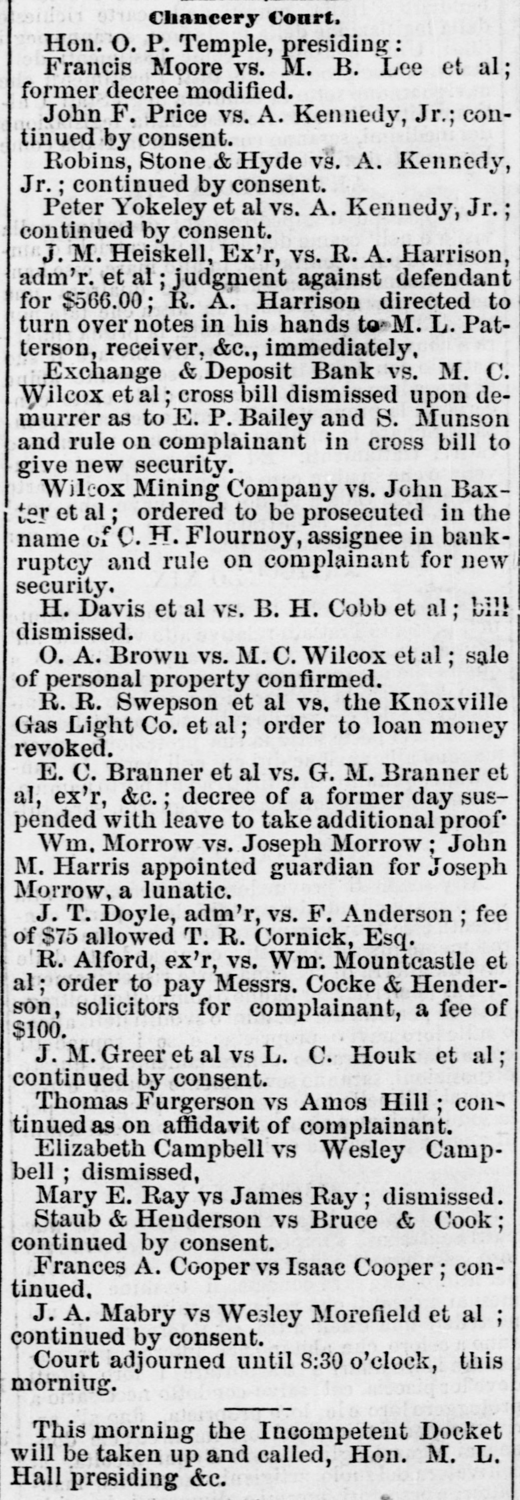 Chancery Court, Hon. O. P. Temple, presiding: Francis Moore VS. M. B. Lee et al; former decree modified. John F. Price VS. A. Kennedy, Jr.; continued by consent. Robins, Stone & Hyde vs. A. Kennedy, Jr.: ; continued by consent. Peter Yokeley et al VS. A. Kennedy, Jr.; continued by consent. J. M. Heiskell, Ex'r, VS. R. A. Harrison, adm'r. et al judgment against defendant for $566.00; R. A. Harrison directed to turn over notes in his hands to M. L. Patterson, receiver, &c., immediately, Exchange & Deposit Bank vs. M. C. Wilcox etal; cross bill dismissed upon demurrer as to E. P. Bailey and S. Munson and rule on complainant in cross bill to give new security. Wilcox Mining Company VS. John Baxter et al; ordered to be prosecuted in the name of C. H. Flournoy, assignee in bankruptcy and rule on complainant for new security. H. Davis et al VS. B. H. Cobb et al; dismissed. A. Brown vs. M. C. Wilcox etal; sale of personal property confirmed. R. R. Swepson et al vs. the Knoxville Gas Light Co. et al; order to loan money revoked. E.C. Branner et al VS. G. M. Branner et al, ex'r, &c.; decree of a former day suspended with leave to take additional proof Wm. Morrow vs. Joseph Morrow; John M. Harris appointed guardian for Joseph Morrow, a lunatic. J. T. Doyle, adm'r, VS. F. Anderson; fee of $75 allowed T. R. Cornick, Esq. R. Alford, ex'r, vs. Wm: Mountcastle et al; order to pay Messrs. Cocke & Henderson, solicitors for complainant, a fee of $100. J. M. Greer et al VS L. C. Houk et al; continued by consent. Thomas Furgerson vs Amos Hill continued as on affidavit of complainant. Elizabeth Campbell VS Wesley Campbell ; dismissed, Mary E. Ray vs James Ray; dismissed. Staub & Henderson VS Bruce & Cook; continued by consent. Frances A. Cooper vs Isaac Cooper; continued. J. A. Mabry vs Wesley Morefield et al ; continued by consent. Court adjourned until 8:30 o'clock, this morning. This morning the Incompetent Docket will be taken up and called, Hon. M. L. Hall presiding &c.
