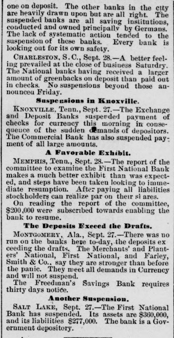 one on deposit. The other banks in the city are heavily drawn upon but are all right. The suspended banks are all saving institutions, conducted and owned principally by Germans. The lack of systematic action tended to the suspension of these banks. Every bank is looking out for its own safety. CHARLESTON, S.C., Sept. 28.-A better feeling prevailed at the close of business Saturdry. The National banks having received a larger amount of greenbacks on deposit than paid out in checks. No suspensions beyond those announced Friday. Suspensions in Knoxville. KNOXVILLE, Tenn., Sept. 27.-The Exchange and Deposit Banks suspended payment of checks for currency this morning in consequeuce of the sudden demands of depositors. The Commercial Bank has also suspended payment of all large amounts. A Favorable Exhibit. MEMPHIS, Tenn., Sept. 28.-The report of the committee to examine the First National Bank makes a much better exhibit than was expected, and steps have been taken looking to immediate resumption. After paying all liabilities stockholders can realize par on their si ares. On reading the report of the committee, $200,000 were subscribed towards enabling the bank to resume. The Deposits Execed the Drafts. MONTGOMERY, Ala., Sept. -There was no run on the banks here to-day, the deposits ex ceeding the drafts. The Merchants' and Planters' National, First National, and Farley, Smith & Co., say they are stronger than before the panic. They meet all demands in Currency and will not suspend. The Freedman's Savings Bank requires thirty days notice. Another Suspension. SALT LAKE, Sept. 27.-The First National Bank has suspended. Its assets are $360,000, and its liabilities $277,000. The bank is a Government depository.