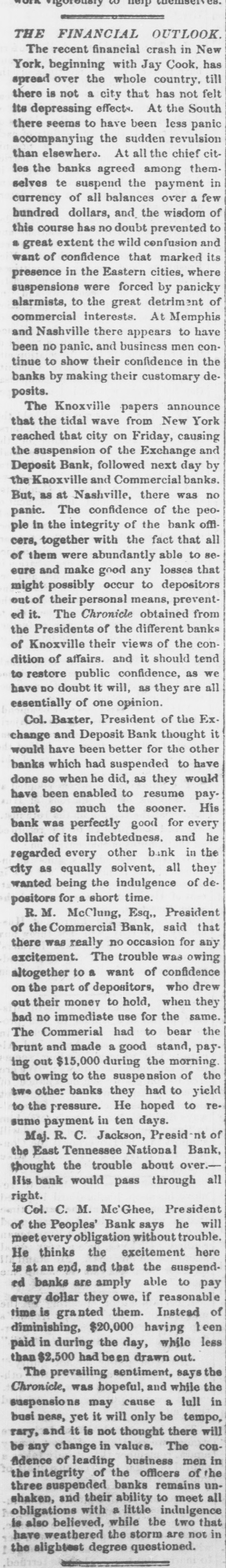 vigorously w neip THE FINANCIAL OUTLOOK. The recent financial crash in New York, beginning with Jay Cook, has spread over the whole country, till there is not a city that has not felt its depressing effects. At the South there seems to have been less panic accompanying the sudden revulsion than elsewhere. At all the chief cities the banks agreed among themselves te in suspend balances the payment few currency of all over a hundred dollars, and the wisdom of this course has no doubt prevented to a great extent the wild confusion and want of confidence that marked its presence in the Eastern cities, where suspensions were forced by panicky alarmists, to the great detriment of commercial interests. At Memphis and Nashville there appears to have been no panic. and business men continue to show their confidence in the banks by making their customary deposits. The Knoxville papers announce that the tidal wave from New York reached that city on Friday, causing the suspension of the Exchange and by Deposit Bank, followed next day banks. the Knoxville and Commercial But, as at Nashville, there was no panic. The confidence of the peoin the of the bank offiwith ple cers, together integrity the fact that all of them were abundantly able to seeare and make good any losses that occur to their means, might out of possibly personal depositors prevented it. The Chronicle obtained from the Presidents of the different banks of Knoxville their views of the condition of affairs. and it should tend to restore public confidence, as we have DO doubt it will, as they are all essentially of one opinion. Col. Baxter, President of the Ex. change and Deposit Bank thought it would have been better for the other banks which had suspended to have done so when he did, as they would have been enabled to resume paymuch sooner. His was every bank ment so perfectly the good for dollar of its indebtedness. and he every regarded other bank all in they the city as equally solvent, wanted being the indulgence of depositors for a short time. R. M. McClung, Esq,, President of the Commercial Bank, said that there was really no occasion for any excitement. The trouble was owing to a want altogether of confidence who drew on the part of depositors, out their money to hold, when they had no immediate use for the same. The Commerial had to bear the brunt and made a good stand, pay. ing out $15,000 during the morning. but owing to the suspension of the two other banks they had to yield to the pressure. He hoped to resome payment in ten days. Maj. R. C. Jackson, President of the East Tennessee National Bank, thought the trouble about over.His bank would pass through all right. Col. C. M. Mc'Ghee, President of the says meetevery obligation Peoples' Bank without he trouble. will He thinks the excitement here is at an end, and that the suspendbanks are pay dollar they owe, every ed amply if able reasonable to time is them. Instead of $20,000 diminishing, granted having Leen less paid in during the day, while than $2,500 had been drawn out. The prevailing sentiment, says the Chronicle, was hopeful, and while the suspensions may cause a lull in busi ness, yet it will only be tempo, rary, and it is not thought there will be any change in values. The conAdence of leading business men in the of three unintegrity suspended the banks officers remains of the all and their ability to meet with a is shaken, obligations also believed, while little the indulgence two that have weathered the storm are not in the slightest degree questioned.