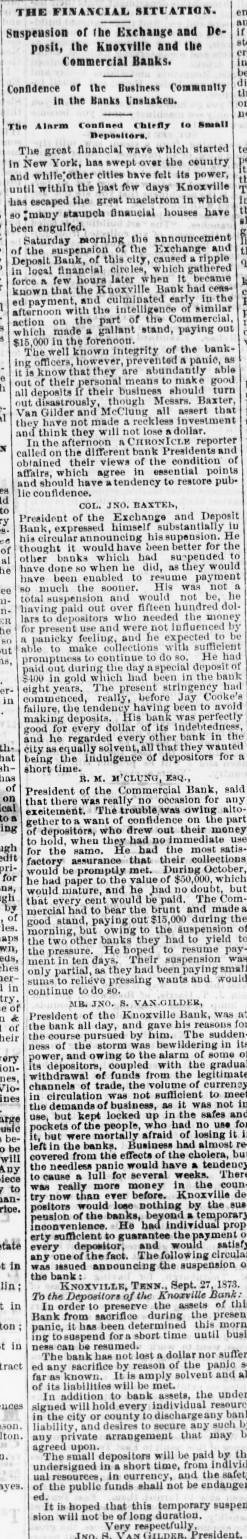 en THE FINANCIAL SITUATION. at if Suspension of the Exchange and Deposit, the Knoxville and the in Commercial Banks. be di tl Confidence of the Business Community or in the Banks Unshaken. n The Alarm Confined Chiefly to small Depositors. The great financial wave which started in New York, has swept over the country and while) other cities have felt its power, until within the past few days Knoxville has escaped the great maelstrom in which so :many staunch financial houses have been engulfed. Saturday morning the announcement and the suspension of the Exchange of Deposit Bank, of this city, caused a ripple local financial circles, which gathered in few hours later when it became force a that the Knoxville Bank had ceas the known payment, and culminated early similar in ed afternoon with the intelligence of on the part of the Commercial, action which made a gallant stand, paying out $15,000 The well in the known forenoon. integrity of the bankofficers, however, prevented a panic, able as ing know that they are abundantly it is of their personal means to make good out all deposits if their business should turn disastrously, though Messrs. Baxter, that 1 out Van Gilder and McClung all investment assert have not made a reckless they and think they will not lose dollar. N In the afternoon a CHRONICLE reporter and on the different bank Presidents of called obtained their views of the condition points affairs, which agree in essential es and should have tendency to restore public confidence. Id COL. JNO. BAXTER, to ry President of the Exchange and Deposit in s. Bank, expressed himself substantially He to his circular announcing his supension. for the of thought it would been better to al other banks which had suspended would he have done so when he did, as they have been enabled to resume payment not a ee much the sooner. His was be, he nso total suspension and would hundred not dolnpaid out over fifteen ER having lars to depositors who needed the money by he present use and were not influenced to be SO for feeling, and he expected sufficient ut a panicky to make collections with as, able to continue to do so. He had paid promptness out during the day a special deposit of the bank $400 in gold which had been in had erThe present stringency Cooke's in eight commenced, years. really, before Jay avoid the tendency having been to failure, deposits. His bank indebtedness, was perfectly making for every dollar of its in the th good he regarded every other bank wanted and equally solvent, all that they for a hat city being the indulgence of depositors shshort time. has R. M. 'CLUNG, ESQ., of on President of the Commercial Bank, said any ical there was really no occasion for to a that exeitement. The trouble was owing altoing to a want of confidence on the money part gether depositors, who drew out their use of when they had no immediate gh edit to hold, the samo. He had the most collections satisfor assurance that their prifor factory be promptly met. During October, which ns, would had paper to the value of $50,000, but gh he mature, and he had no doubt, Comby would cent would be paid. The made of that every had to bear the brunt and the les. mercial stand, paying out $15,000 during of 208 good but owing to the suspension yield wn, morning, two other banks they had to to the He hoped to resume pay- was eds, hes the pressure. in ten days. Their suspension small erment partial, as they had been paying would in sums only to relieve pressing wants and continue to do so. try. e of MR. JNO. S. VAN GILDER, n & President of the Knoxville Bank, was for a: of bank all day, and gave his reasons sudden heir the pursued by him. The in its the course of the storm was bewildering o ery ness and owing to the alarm of some gradual ionpower, coupled with the nes, withdrawal its depositors, of funds from the legitimate Viochannels of trade, the volume of currency to meet ines circulation was not sufficient not in in demands of business, as it was safes and arge the but kept locked up in the use for usic use, of the people, who had no it i bepockets were mortally afraid of losing almost re o be it, but in the banks. Business had bu will left from the effects of the cholera, Any covered needless panic would have a tendency There iece the a lull for several weeks. the coun/ to to cause really more money in de anwas than ever before. Knoxville the sus rioe. try now would lose nothing by temporary had He positors pension of the banks, beyond individual a prop state erty sufficient inconvenience. to guarantee the payment satisfy depositor, and would circular every of the fact. following o in any was one issued announcing the suspension the bank lin; KNOXVILLE, TENN., Sept. 27, Bank 1873. t in To the Depositors of the Knoxville of thi order to preserve the assets ton Bank In from sacrifice determined during the this present morn ing in panie, to suspend it has been for a sbort time until busi tract ness can The bank be resumed. has not by reason lost a dollar of the nor panic suffer ed any known. sacrifice It is amply solvent and of far as liabilities will be met. its addition to bank assets, the resour under nces In will hold.every individual ban 3on. signed the city or county to dischargeany such b Iton. in and desires to secure, any may any liability, private arrangement that agreed n. The small upon. depositors will be paid individ by th in a short time, from the safet ayes. undersigned in currency, and endange of ual the resources, public funds shall not be ed. It is hoped that this duration. temporary susper sion will not be of long Very respectfully INO S. VAN GILDER President.