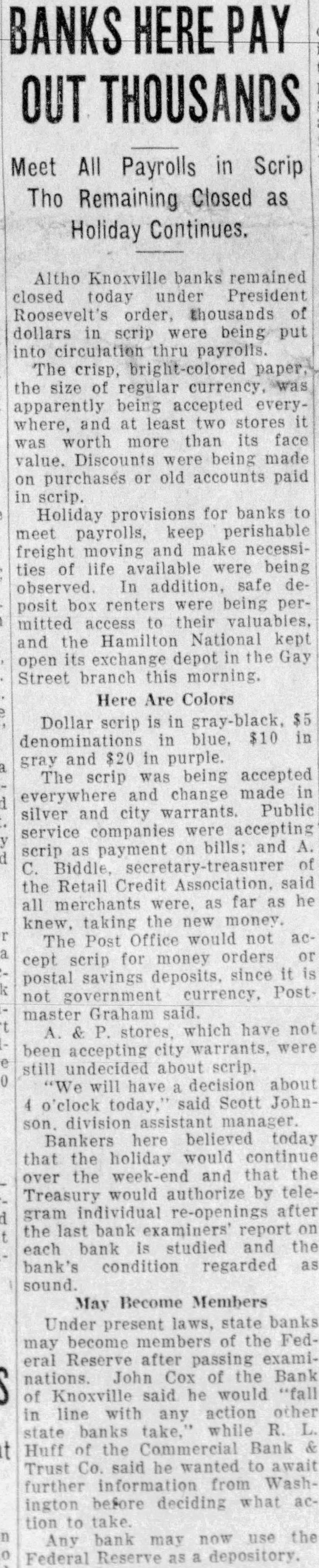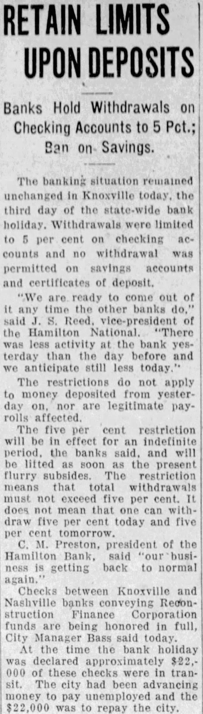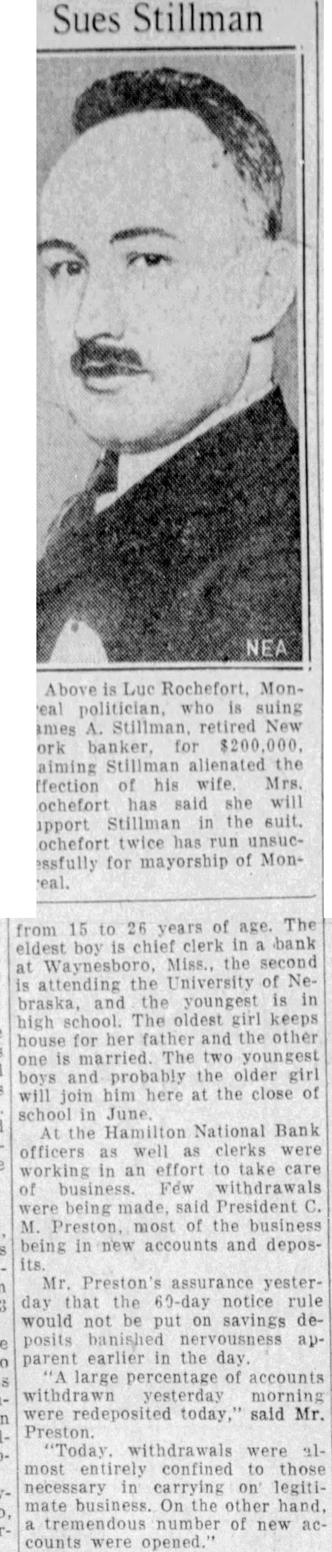 Sues Stillman from 15 to 26 years of age. The eldest boy is chief clerk in bank at Waynesboro, Miss. the second is attending the University of Nebraska, and the youngest is in high school. The oldest girl keeps house for her father and the other one is married. The two youngest boys and probably the older girl will join him here at the close of school in June At the Hamilton National Bank officers as well as clerks were working in an effort to take care of business. Few withdrawals were being made said President M. Preston most of the business being in new accounts and deposits. Mr. Preston S assurance yester day that the 60-day notice rule would not be put on savings deposits banished nervousness apparent earlier in the day "A large percentage of accounts withdrawn yesterday morning were redeposited today. said Mr. "Today withdrawals were almost entirely confined to those necessary in carrying on legitimate business. On the other hand. a tremendous number of new accounts were opened.'