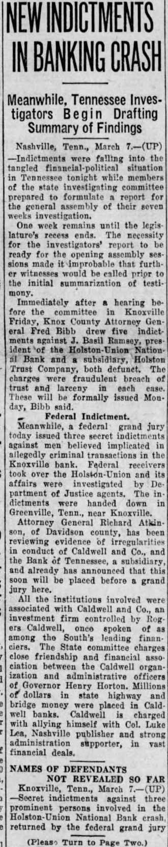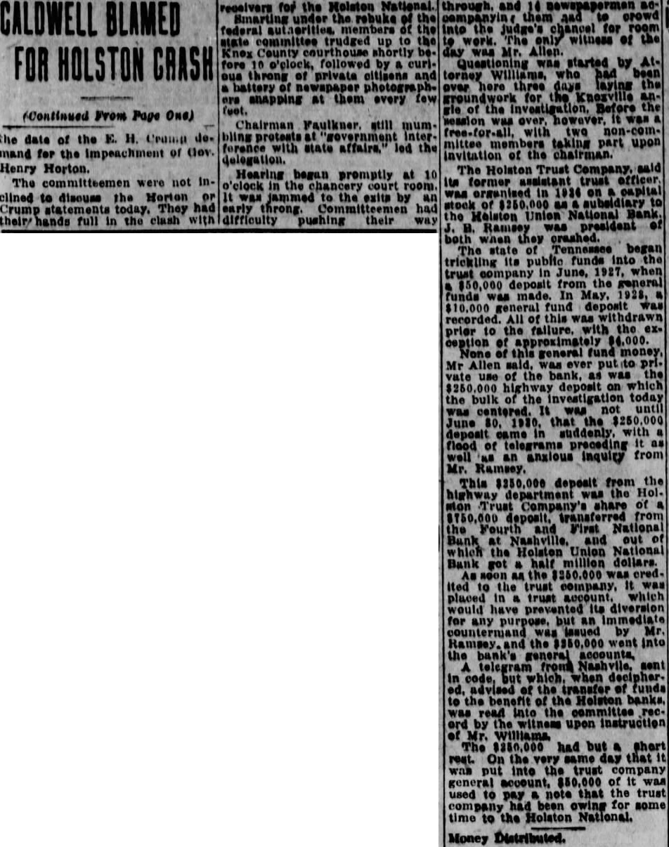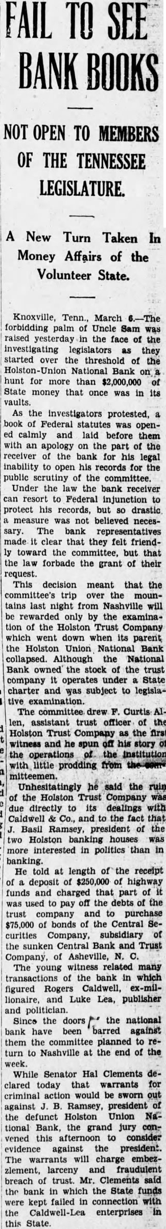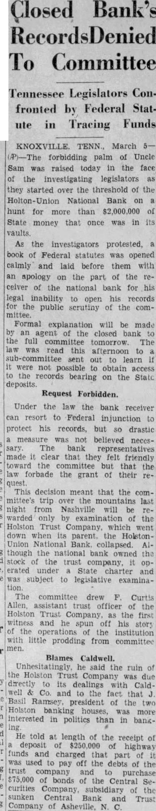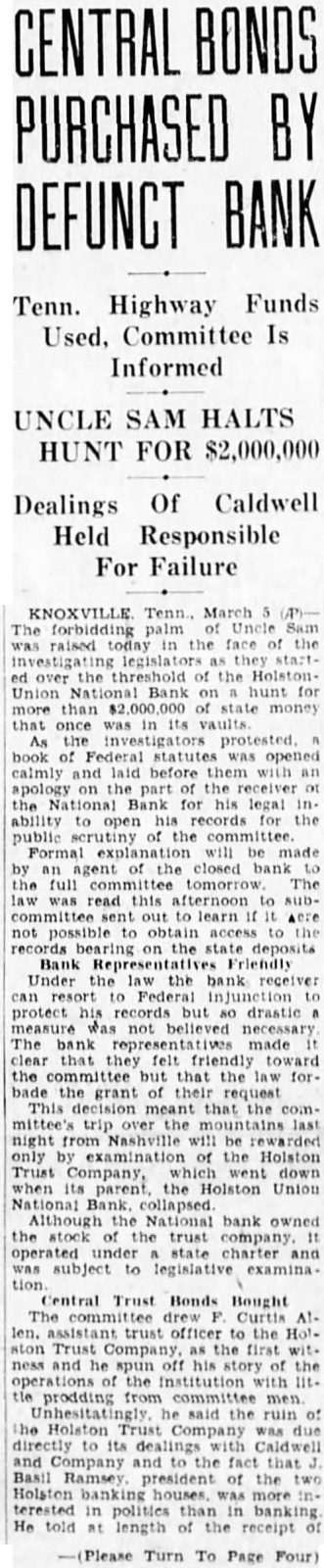 "Mr. Ramsey was no dissatisfied with the of anyone attempting to thwart his plans that he make it NO embarrassing for Mr. Slaughter. he left,'t said Mr. Blaughter's former If Mr. Slaughter decides to swer the committee's long distance subpoena to his home in Mobile, he will be here tomorrow as voluntary witness against Mr. Ramsey The details of the transactions with Caldwell & Company, credited with putting the trust out of business, were revealed in question begun by Speaker Haynea had many deals with Caldwell & Company after Caldwell and Lea bought into the Holston banks? A.-We bought quite few stocks through Caldwell & Company Q-Name some of them. A.Tennessee Products, Southern Surety, Memphis Commercial Appeal bonds, Memphis Natural Gas, Alli- and gator Raincoat Corporation Kentucky Rock Asphalt. Q-The truth that your concorn and Caldwell Company were Interwoven? -Practically all our capital was tied up by stocks and bonds purchased through Caldwell. unloaded on you? A -That is your dealings with Cald. well & Company really broke your trust company? A.-There is no question about it in my mind. Q.-1s It your opinion that the $250,000 deposit was largely the result of the close association of the Holston banks with Caldwell Company A.-My manipulated opinion is that by the deposit was Caldwell Company for the purpose of getting additional money to be used in making the Holston Trust Company buy additional stocks. Caldwell Q-In other words. state read money was diverted to buy Caldwell stocks? we had no for the deposit. need "It was in the atmosphere Cald at that the Knexville well relation to the Holston banks was a poisonous influence, wasn't it, Mr Allen?" asked Senator Craig so. Midnight think rides by Basil Ramsey between Knoxville and Nashville but the questioning. witness came up had litle information about them. Q-Did you know that Ramsey took midnight ride to Nashville just before bank came to Knoxville, got some securities, and then after the examiners left. shuttied them back to Nashville so they of for the Bank ready would Tennessee be know he went to made night trips, but don't know anything about the shifting of se. curities before the coming ch.bank examiners. said the in Florida now, "the newspaper way doing Mr. Waldauer and his assistants withdrew at the close of the sension yesterday, it was learned, and the sommittee left for Knoxville appar ently without having arranged for the keeping of its record.