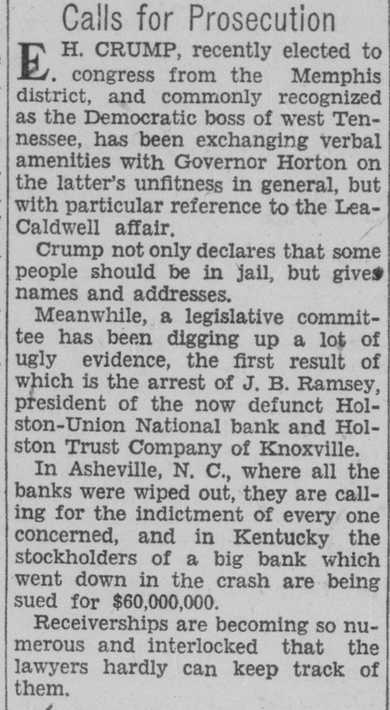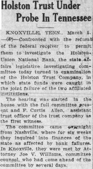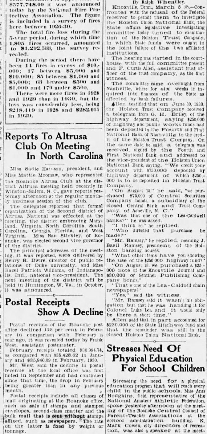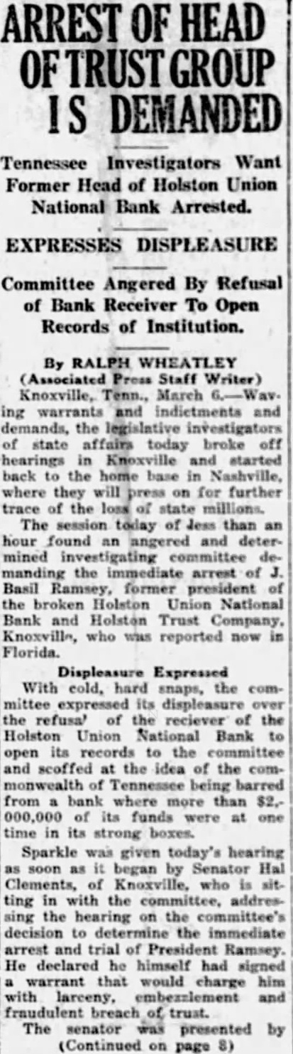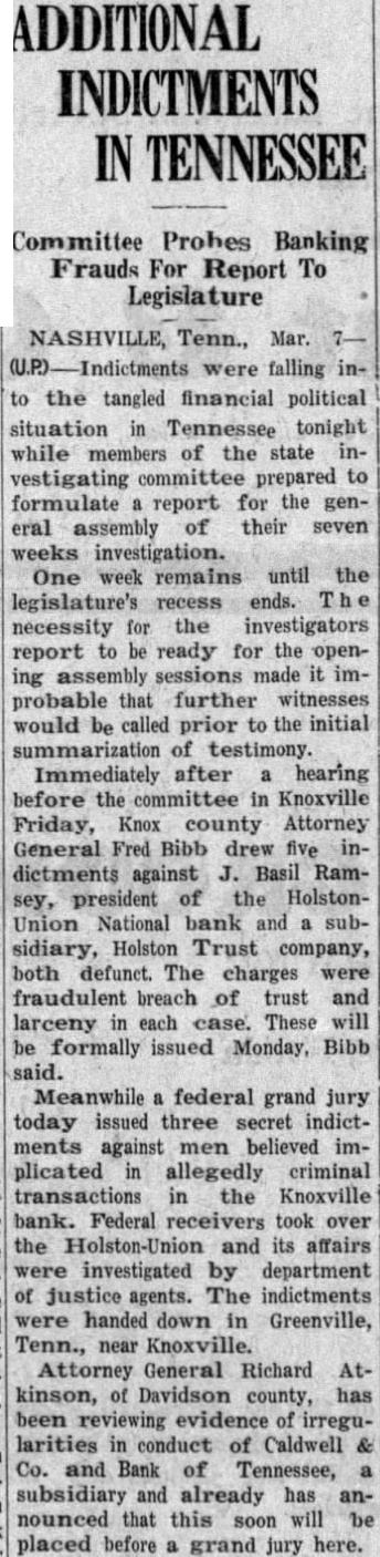 "Mr. Ramsey was no dissatisfied with the of anyone attempting to thwart his plans that he make it NO embarrassing for Mr. Slaughter. he left,'t said Mr. Blaughter's former If Mr. Slaughter decides to swer the committee's long distance subpoena to his home in Mobile, he will be here tomorrow as voluntary witness against Mr. Ramsey The details of the transactions with Caldwell & Company, credited with putting the trust out of business, were revealed in question begun by Speaker Haynea had many deals with Caldwell & Company after Caldwell and Lea bought into the Holston banks? A.-We bought quite few stocks through Caldwell & Company Q-Name some of them. A.Tennessee Products, Southern Surety, Memphis Commercial Appeal bonds, Memphis Natural Gas, Alli- and gator Raincoat Corporation Kentucky Rock Asphalt. Q-The truth that your concorn and Caldwell Company were Interwoven? -Practically all our capital was tied up by stocks and bonds purchased through Caldwell. unloaded on you? A -That is your dealings with Cald. well & Company really broke your trust company? A.-There is no question about it in my mind. Q.-1s It your opinion that the $250,000 deposit was largely the result of the close association of the Holston banks with Caldwell Company A.-My manipulated opinion is that by the deposit was Caldwell Company for the purpose of getting additional money to be used in making the Holston Trust Company buy additional stocks. Caldwell Q-In other words. state read money was diverted to buy Caldwell stocks? we had no for the deposit. need "It was in the atmosphere Cald at that the Knexville well relation to the Holston banks was a poisonous influence, wasn't it, Mr Allen?" asked Senator Craig so. Midnight think rides by Basil Ramsey between Knoxville and Nashville but the questioning. witness came up had litle information about them. Q-Did you know that Ramsey took midnight ride to Nashville just before bank came to Knoxville, got some securities, and then after the examiners left. shuttied them back to Nashville so they of for the Bank ready would Tennessee be know he went to made night trips, but don't know anything about the shifting of se. curities before the coming ch.bank examiners. said the in Florida now, "the newspaper way doing Mr. Waldauer and his assistants withdrew at the close of the sension yesterday, it was learned, and the sommittee left for Knoxville appar ently without having arranged for the keeping of its record.