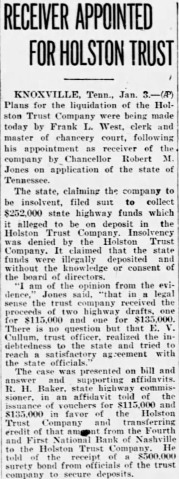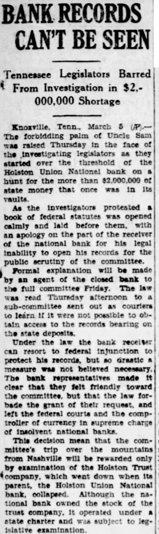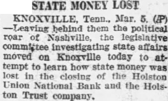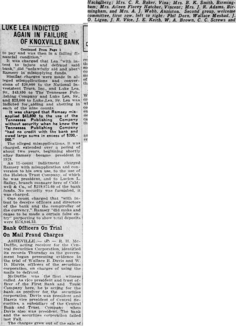 Yesterday, the witness said, payment $2,500 was made on this note to the receivers. making a total of $7,500 that been paid on it by the Tennessee Publishing Company Q.-Has Col. Lea, or his son. or Mr. Charlet been in here recently A.-Not that know of. Back came the United States mail angle of the story. on which the committee attorneys are putall these payments received in the U. N. mail? The trust company invested $30. 000 of the highway money bonds of the Knoxville Sentinel Company, the witness said. The the loan on the newspaper notes, the $75,000 for North Care. lina securities and the 000 pay its own notes for $230,000 of the $250,000 highway deposit. Q.What became of the re. maining $20,0007 A.-It is still here. "You mean it was there," snorted Chairman Faulkner. The came in exactly 10 days after Mr. Ramsey had walk ed into directors' meeting and suggested that the previous resolution to accept no deposits be scinded. The state banking partment never acted upon this move to receive deposits, but the state money taken anyway At one the trust had $5,000 note on its hands signed by Colonel Lea. but this was paid off. the witness said Who arranged that loan? A Ramsey. The colonel also, through Mr Ramsey. had the trust company take trade of the Belle Meade Land Company one of his Nashville corporations. For handling of this paper, $500 fee was paid. although the check for It was not brought out of Mr Ramsey's private desk until trust officials questioned the handling of the item. It was this item that led to the of the trust company officials, Made Him Resign.