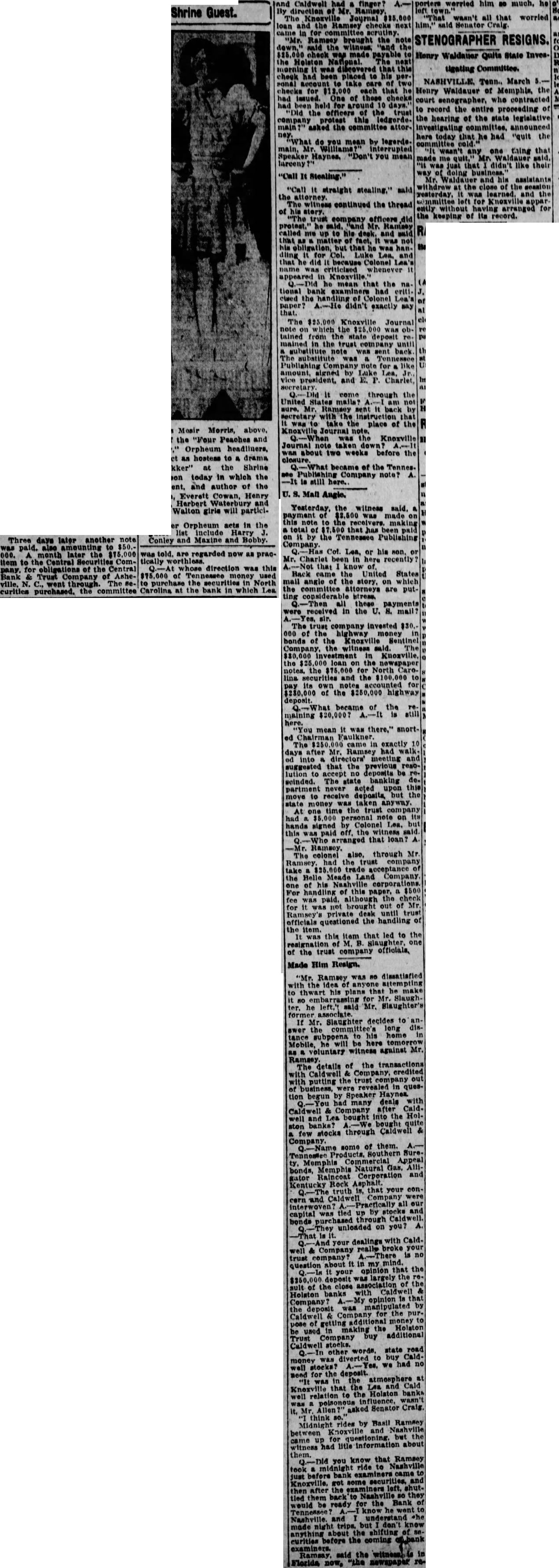 Three days later another note Conley and Maxine and Bobby. was paid. also amounting to $50.000. month later the $75,000 was told. are regarded now as pracItem to the Central Com- tically pany. for obligations of the Central Q.-At whose direction was this Bank & Trust Company of Ashe- $75,000 of Tennessee money used ville, N. C., went through. The to purchase the securities in North curities purchased. the committee Carolina at the bank in which Lea and Caldwell had a finger? porters worried him so much, he By direction of Mr. Ramsey. "That wasn't all that worried loan and the Ramsey checks next him," said Senator Craig came in for committee scrutiny "Mr. Ramsey brought the note STENOGRAPHER RESIGNS. said the "and the $25,000 check was made payable to the The next morning was liscovered that this check had been placed to his personal account take care of two checks for $12,000 each that Henry Waldauer of Memphis, the issued. of these checks court senographer, who contracted had been held for around 10 days.' to record the entire proceeding of "Did the officers of the trust company this the hearing of the state legislative protest main?" asked the committee attor. investigating committee. announced ney here today that had "quit the "What do you mean by legards. committee main, Mr. "It wasn't any one thing that Speaker Haynes, "Don't you mean made me quit,' Mr. Waldauer said. "It was just that didn't like their
