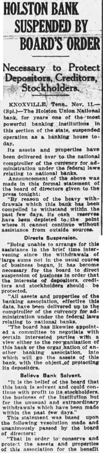 KNOXVILLE Tenn., Nov. Holston Union National for years of powerful banking institutions in this section of the state, suspended operation as banking house today. Its assets and properties have been over to the national comptroller of the currency for administration under the federal laws relating to national banks. of the above was made in this formal statement the board directors given to the press tonight: reason of the heavy withdrawals has been compelled to withstand within the past few days, its cash reserves have depleted point where cannot without assistance from outside sources.