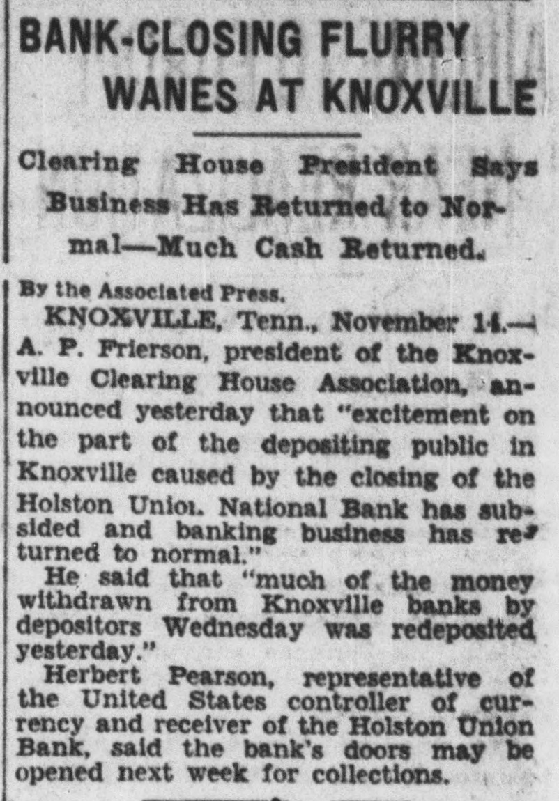 BANK-CLOSING FLURRY WANES AT KNOXVILLE Clearing House President Says Business Has Returned to Normal-Much Cash Returned. By the Associated Press. KNOXVILLE, Tenn., November 14.-1 A. P. Frierson, president of the Knoxville Clearing House Association, announced yesterday that "excitement on the part of the depositing public in Knoxville caused by the closing of the Holston Union. National Bank has subsided and banking business has res turned to normal." He said that "much of the money withdrawn from Knoxville banks by depositors Wednesday was redeposited yesterday." Herbert Pearson, representative of the United States controller of currency and receiver of the Holston Union Bank, said the bank's doors may be opened next week for collections.