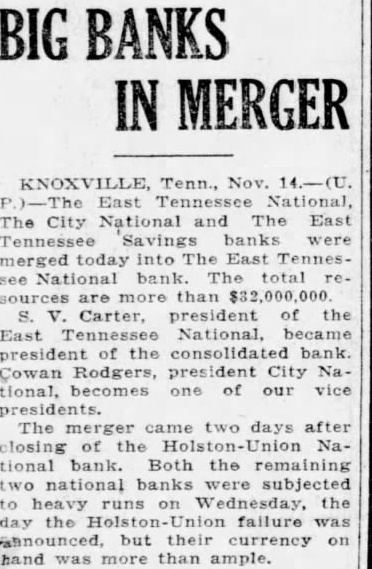 KNOXVILLE, Nov. East National, The City National and The East Tennessee Savings banks merged today into The East Tennessee National bank. The total sources are more than V. Carter, president of the East Tennessee National, president of the consolidated bank. Cowan Rodgers, president City tional, becomes one of our presidents. The merger came two days after closing of the Holston-Union National bank. Both the remaining two national banks were subjected heavy runs Wednesday, the day the Union failure but their currency hand was more than ample.