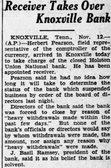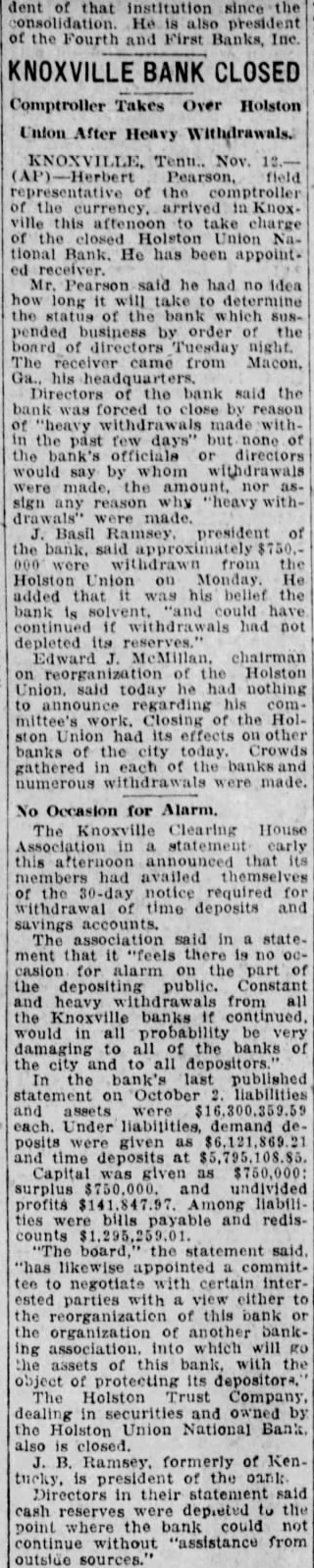 dent of that institution since the He is president of the Fourth and First Banks, Inc. KNOXVILLE BANK CLOSED Comptroller Takes Over Holston Union After Heavy Withdrawals. representative of the comptroller of ville this to take charge of the closed Holston Union National Bank. He has been appoint. ed Mr. Pearson said he had no idea how long take to the status of the which suspended business by order the board of directors Tuesday night. The receiver came from Macon. Ga. rectors of the bank said the was forced to close reason of with the past few days" but none of the bank's officials or directors would say by whom withdrawals were made the amount, nor as. sign any reason "heavy withBasil Ramsey president of the bank. said $750 000 were withdrawn from the Holston Union on Monday. He added that was his belief the bank have continued if withdrawals had not depleted its Edward McMillan chairman on reorganization of the Holston Union. said today had nothing to mittee's Closing of the Holston Union had its effects on other banks of the city today Crowds gathered in each of numerous withdrawals were made.