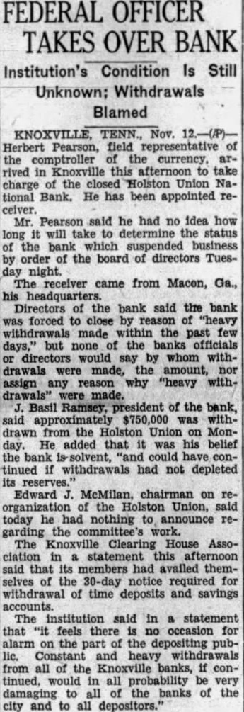 KNOXVILLE, TENN., Nov. Herbert Pearson, field of the comptroller of the currency, arrived in this to take charge the Holston Union National Bank. He has been appointed receiver. Mr. Pearson said he had no idea how long will take to determine the status the bank which business by order the board of directors Tuesday The receiver came from Macon, Ga., his headquarters. Directors of the bank said the bank was forced to close by reason "heavy withdrawals made within the past few days," but none of the banks officials or directors would say by whom withdrawals were made, the amount, assign any reason why "heavy withdrawals" Basil Ramsey president of the bank, said approximately $750,000 withdrawn from the Union on Monday. He added that was his belief the bank solvent, could have tinued if withdrawals had not depleted reserves." Edward McMilan, chairman on rethe Union, said today he had nothing to, announce regarding The Clearing House Association in statement this afternoon said that its members had availed themselves of the 30-day notice required for withdrawal of time deposits and savings The institution said in statement that "it feels there occasion for on the part of the depositing public. Constant and withdrawals from all of the Knoxville banks, if continued, would in all probability be very damaging all the banks of the city and to all depositors.