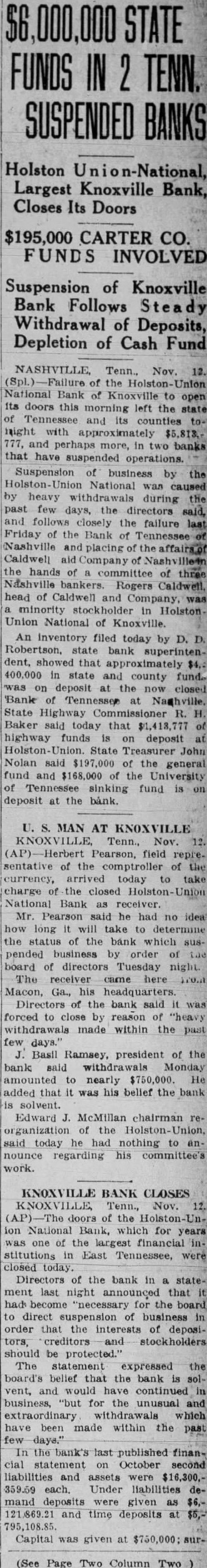 Nov. the National Bank Knoxville to open its doors this morning left the state Tennessee and night with approximately $5,813,777, and more, in two banks that have suspended operations Suspension of business by National was caused heavy during past few days, the the failure Friday the Bank of Tennessee Nashville of the Caldwell hands of committee three bankers. Rogers Caldwell, head of Caldwell and Company, minority stockholder in Holston Union National of Knoxville. An inventory filed today by Robertson, state bank superintendent, that approximately 400,000 state county deposit the closed Bank Tennessee Naghville, State Baker today that highway funds deposit State John Nolan $197,000 of the general fund and $168,000 the University of sinking fund deposit at the bank.