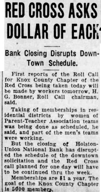 First reports the Roll Call for Knox County Chapter of Red Cross being taken today will made Bonner, Roll Call chairman, said. Taking of memberships in residential districts women of Association teams being done scheduled, he said, and part of the men's teams working. But the closing of HolstonUnion National Bank has disruptthe schedule of the downtown solicitation the Red Cross call planned for one day will have continued thru the week. Memberships year. The goal the Knox County Chapter 5000 members.