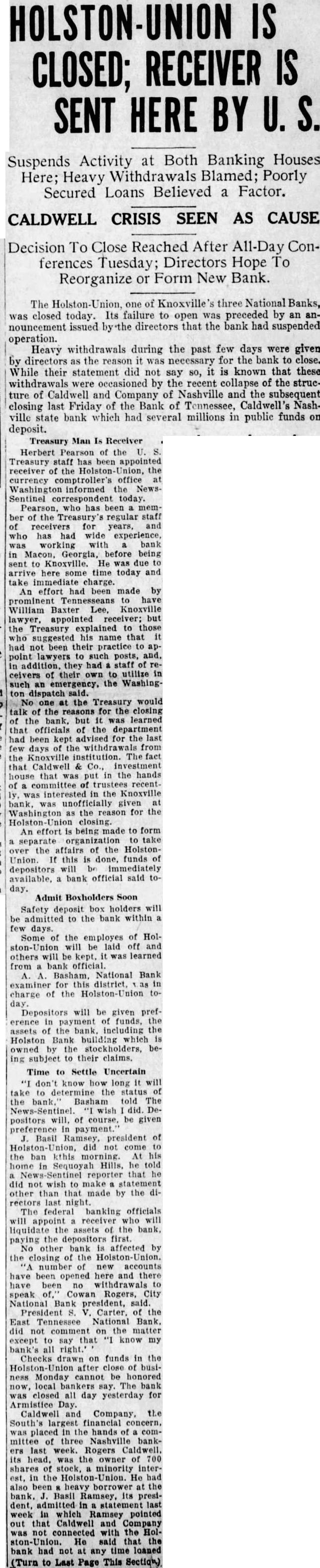 Time to Settle Uncertain don't know how long will determine the status bank. Basham told Depositors will, course, be given preference payment. Basil Ramsey, president not come kthis morning. At his the ban home Hills, told reporter that he did wish make statement other than that made by the rectors night. The federal banking officials will appoint receiver who will liquidate assets the the depositors first. other bank affected by the closing the number new accounts have been opened here and there have been speak Cowan Rogers, City National Bank president, said. President Carter, the East Tennessee National Bank. not comment the matter except to say that know my right.' Checks drawn on funds in the after close of busiMonday cannot be honored local bankers The bank closed all day yesterday for Armistice Day. Caldwell and the South's largest financial concern, placed the hands mittee three Nashville banklast week. Rogers was the owner of 700 shares stock, minority the He had also been heavy borrower the bank, Basil Ramsey, its presiadmitted statement last week which Ramsey pointed that Caldwell and Company not connected the He said that the bank had not time loaned any to Last This