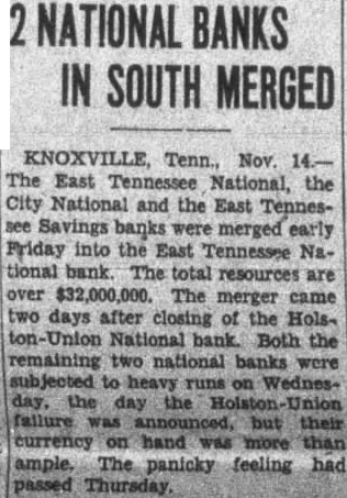 KNOXVILLE, Tenn., Nov. 14.The East Tennessee National, the City National and the East Tennessee Savings banks were merged early Friday into the East Tennessee National bank The total resources are over $32,000,000. The merger came two days after closing of the Holsn-Union National bank. Both the remaining two national banks were subjected to heavy runs on Wednesday. the day the Holston Union failure was but their currency on hand was more than ample. The panicky feeling had passed Thursday.