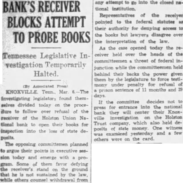Treasury Man Is Receiver Herbert Pearson of the Treasury staff has been appointed receiver the the currency comptroller's office informed the NewsSentinel correspondent today. Pearson, who has been member of the Treasury's regular staff receivers years, and who has had wide experience, working with bank Macon, Georgia, before being sent to Knoxville. He was due here time today and immediate charge. effort had been made by prominent Tennesseans have William Baxter Lee, Knoxville lawyer, appointed receiver; but the Treasury explained to those suggested his name that had not been their practice to point lawyers to such posts, and, addition, they had staff ceivers their own utilize such emergency, the dispatch the Treasury would talk of the reasons for the closing bank, but it learned that officials of the department had been kept the last days the withdrawals from the Knoxville institution. fact that Caldwell investment house that was put in the hands of committee trustees recentwas interested in the Knoxville bank, unofficially given Washington reason for the closing. An effort being made to form separate organization take the affairs of the HolstonUnion. this funds of depositors will immediately available, bank official said day.
