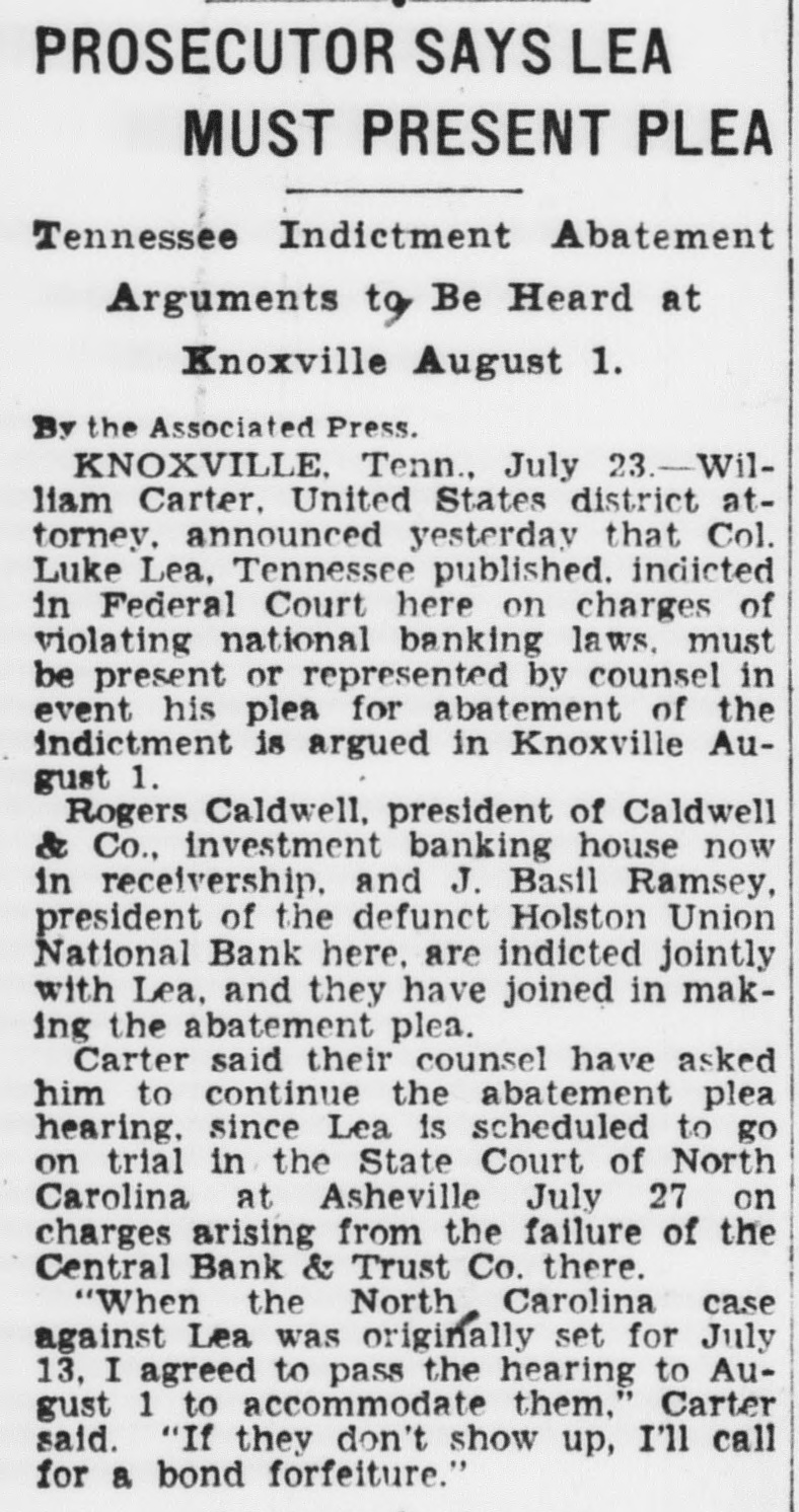 Carter said their counsel have asked him to continue the abatement plea hearing, since Lea is scheduled to go on trial in the State Court of North Carolina at Asheville July 27 on charges arising from the failure of the Central Bank & Trust Co. there.