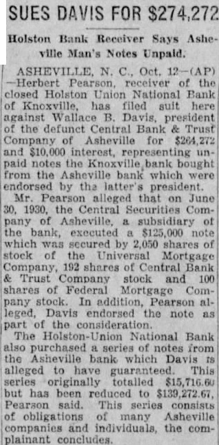ASHEVILLE N. C., Oct. Herbert receiver of the closed Holston Union National Bank of has filed suit here against Wallace B. Davis, president of the Central Bank Trust of Asheville for $264 and $10,000 interest, unpaid the Knoxy bank bought from the bank which were endorsed by the latter's president. Mr. Pearson alleged that on June 30, 1930, the Central Securities Company of Asheville, a subsidiary of the bank, executed $125,000 note which was secured by 2,050 shares of stock of the Mortgage Company, 192 shares Central Bank Trust Company stock and 100 shares of Federal Mortgage Company stock. In addition, Pearson alleged, Davis endorsed the note as part the consideration. The Holston Union National Bank also purchased of from the Asheville bank which Davis IS alleged to guaranteed This series originally totalled $15,716.60 but has been reduced to $139,272.67 Pearson said. This series consists of obligations of many Asheville companies individuals, the complainant concludes.