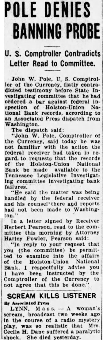 John W. Pole, U. Comptroller of the Currency, flatly contradicted testimony before State vestigating committee that ordered bar against federal spection Holston-Union tional Bank records, according to Associated Press dispatch from Washington. The dispatch said: "John W. Pole, Comptroller of the Currency, said today he not familiar with the action the federal receiver had taken in gard. requests that the records the Holston-Union National Bank be made available to the Tennessee Legislative Investigating committee investigating bank failures. said the matter was being handled the federal receiver and his and reports had not been made to Washing- letter signed by Receiver Herbert Pearson, read to the mittee this morning by Attorney Harley Fowler, Pearson said: reply to your request that (the committee) permitto examine into the affairs the National Bank. respectfully advise you have been instructed by the Comptroller the Currency to not agree that this be