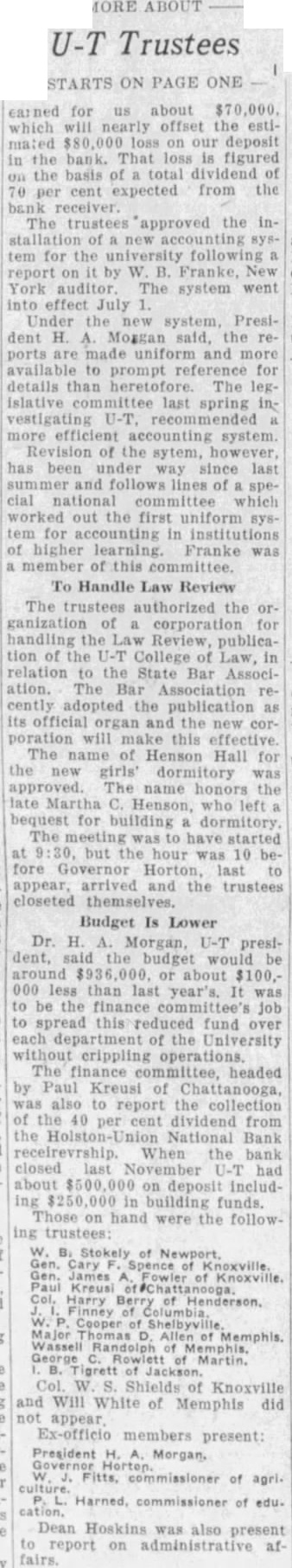 Dr. H. Morgan, U-T president, said the budget would be around $936,000. or about $100,000 less than last year's. It was to be the finance committee's job to spread this reduced fund over each department of the University without crippling operations. The finance committee, headed by Paul Kreusi of Chattanooga, was also to report the collection of the 40 per cent dividend from the Holston-Union National Bank receirevrship. When the bank closed last November U-T had about on deposit including in building funds. Those on hand were the following trustees: Stokely of Newport Gen. Spence Kreusi Major Memphis. Wassell Martin. Col. Shields of Knoxville and Will White of Memphis did not appear Ex-officio members present: President Morgan. culture. Fitts, commissioner of agri. cation. Harned, commissioner of edu. Dean Hoskins was also present to report on administrative affairs.
