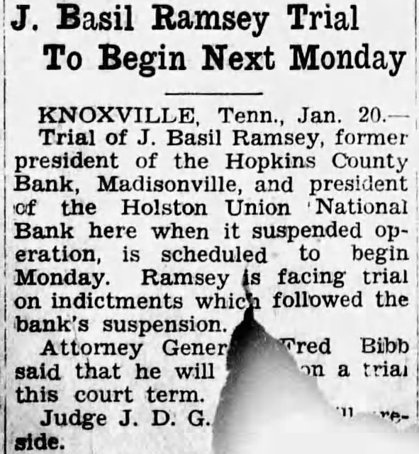 KNOXVILLE Tenn., Jan. 20. Trial of J. Basil Ramsey, former president of the Hopkins County Bank, Madisonville, and president of the Holston Union National Bank here when it suspended operation, is scheduled to begin Monday. Ramsey is facing trial on indictments which followed the bank's suspension. Attorney Gener Bibb said that he will a trial this court term. Judge J. D. G. side.