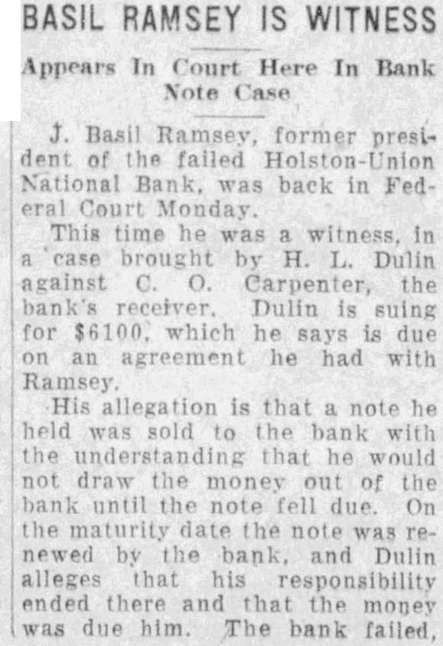J. Basil Ramsey former president the failed Holston Union National Bank, was back in Federal Court This time he was witness. in case brought by H. Dulin against Carpenter, the bank's receiver. Dulin is suing for $6100, which he says is due on agreement he had with Ramsey His allegation is that note he held was sold the bank with the understanding that he would not draw the money of the bank until the note due. On the date the note was renewed by the and Dulin alleges his responsibility ended and was due him. The bank failed