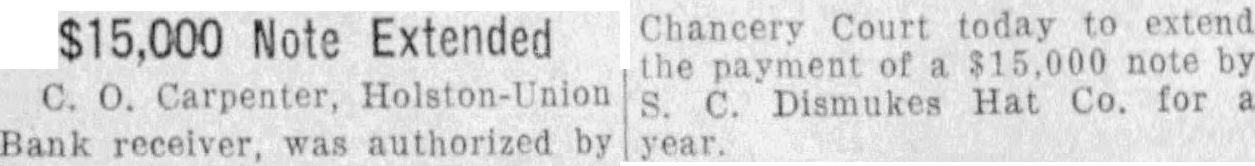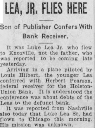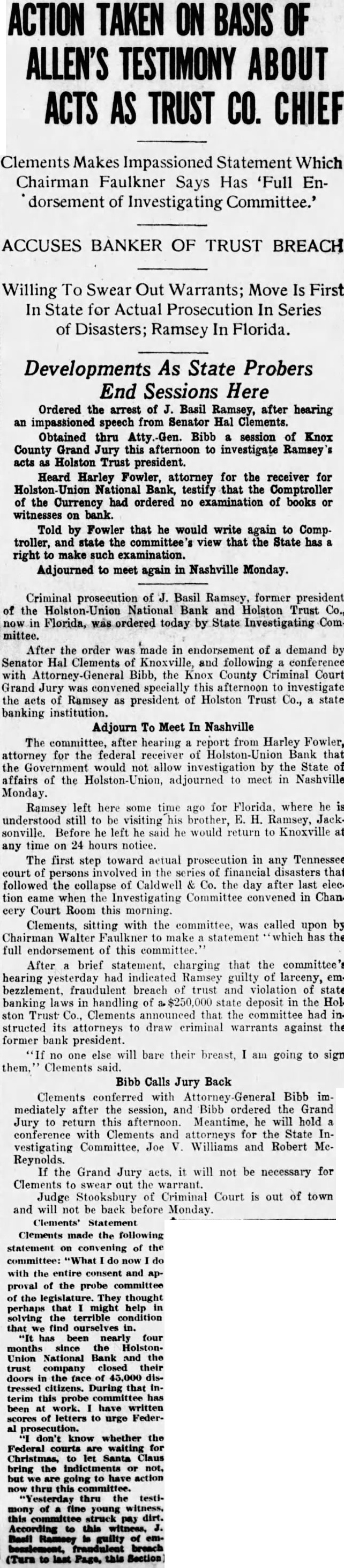 Finishing Co. bonds of $75,000. Alabama Mills Co. bonds of $75,000 and Frank Silk Mills $75,000. Holston-Union, the bill avers. actually paid Caldwell and Co. $300,000 in cash for the bonds and describes a "round robin of paper transactions' whereby Caldwell & Co. took the $300,000 and purchased bonds from the state of Mississippi. The state of Mississippi placed the money on deposit in the Capital National Bank, of Jackson, Miss., and that bank, in turn, deposited it in the Holston-Union, the bill says. Thus, according to the bill "Caldwell and Co. obtained $300, 000 of bonds of the state of Mississippi and Holston-Union became indebted to the Capital National Bank for $300,000 and had, to offset this obligation, only these worthless bonds of par value of $300,000." "Helped Each Other" Ramsey, according to the bill. had business connections with Rogers Caldwell and the Bank of Tennessee and the two "were accustomed to favoring each other in matters pertaining to their personal affairs, their co-operation consisting principally of aidIng each other financially by loans of money. Said Caldwell caused companies in which he was interested to lend said Ramsey money and the latter, without authority, frequently caused the Hoiston-Union to lend or advance money to said Caldwell and companies in which he was interested." Luke Lea also was described as henchman of Ramsey's in that the two helped each other financially Ramsey thru Holston funds. "On Sept. 26, reads the bill. "Ramsey was insolvent and desired to procure the sum of $14,500. He caused the said HolstonUnion Bank to deliver the sum of $14,500 to the Bank of Tennessee and immediately borrowed said sum from latter bank which was at the time hopelessly insolvent, which said Ramsey fully knew. Said Ramsey knew that at the time the Bank of Tennessee was indebted to the said HolstonUnion Bank by note in the principal sum of $100,000 and that note. Said note, in fact, never has been paid. Said Ramsey also knew that said Bank of Tennessee was also indebted to a corporation known as the Knoxville Journat, Inc., in the proximate amount of $100,000 and said Bank of Tennessee was wholly unable to pay said indebtedness. The $14,500 which Ramsey is alleged to have caused the Holston-Union to deliver to the Bank of Tennessee was done by Ramsey without authority, the bill declared. The act was not approved by the Board of Directors or the bank's Finance Committee, it is alleged. On Feb. 21, 1930, according to Pearson's bill, Ramsey presented application for a loan of $150,000 to be evidenced by a note executed by persons known as William White, Edward Potter and Rogers Caldwell The loan was to be secured by 510 shares of the capital stock of East Tennessee National Bank Ramsey it is set out, was authorized by the Finance Committee to make the loan in reliance upon a note executed by White, Potter and Caldwell to be secured by the stock collateral. Ramsey "with dishonest Intent and in violation and advanced said sum in consideration of a note signed only by said William White with the described collateral deposited as security, reads the bill. The collateral at that time was of sufficient value to fully secure payment of the note. Pearson's bill declares, and continued to be 60 until after May 28, 1930, when Ramsey "with dishonest intent, surrendered said collateral upon receiving a payment of $110,000 on said note, leaving unpaid balance in principal amount of $40,000. Said William White at that time was insolvent and is insolvent now." This transaction was described in the bill among many others as a favor to Luke Lea, al-