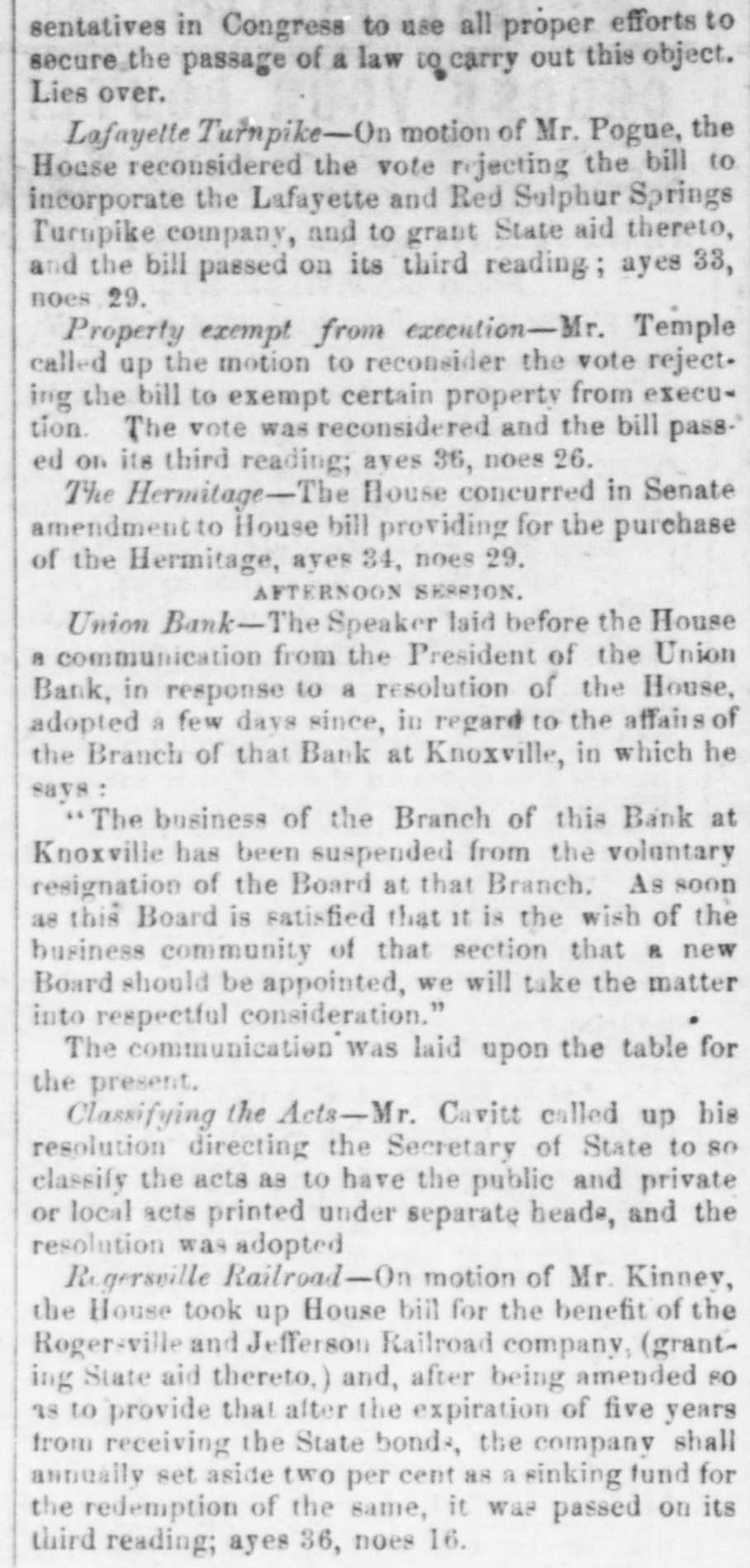 sentatives in Congress to use all proper efforts to secure the passage of a law to carry out this object. Lies over. Lafayette Turnpike-On motion of Mr. Pogue, the House reconsidered the vote rejecting the bill to incorporate the Lafayette and Red Sulphur Springs Turnpike company, and to grant State aid thereto, and the bill passed on its third reading; ayes 33, noes 29. Property exempt from execution-Mr. Temple called up the motion to reconsider the vote rejecting the bill to exempt certain property from execution. The vote was reconsidered and the bill passed on its third reading; aves 36, noes 26. The Hermitage-The House concurred in Senate amendmentto House bill providing for the purchase of the Hermitage, ayes 34, noes 29. AFTERNOON SESSION. Union Bank-The Speaker laid before the House a communication from the President of the Union Bank, in response to a resolution of the House, adopted a few days since, in regard to the affairs of the Branch of that Bank at Knoxville, in which he says: The business of the Branch of this Bank at Knoxville has been suspended from the voluntary resignation of the Board at that Branch. As soon as this Board is satisfied that it is the wish of the business community of that section that a new Board should be appointed, we will take the matter into respectful consideration." The communication was laid upon the table for the present. Classifying the Acts-Mr. Cavitt called up bis resolution directing the Secretary of State to so classify the acts as to have the public and private or local acts printed under separate heade, and the resolution was adopted Regersville Railroad-On motion of Mr. Kinney, the House took up House bill for the benefit of the Rogersville and Jefferson Railroad company, (granting State aid thereto,) and, after being amended 80 as to provide that after the expiration of five years from receiving the State bonds, the company shall annually set aside two per cent as a sinking fund for the redemption of the same, it was passed on its third reading; ayes 36, noes 16.